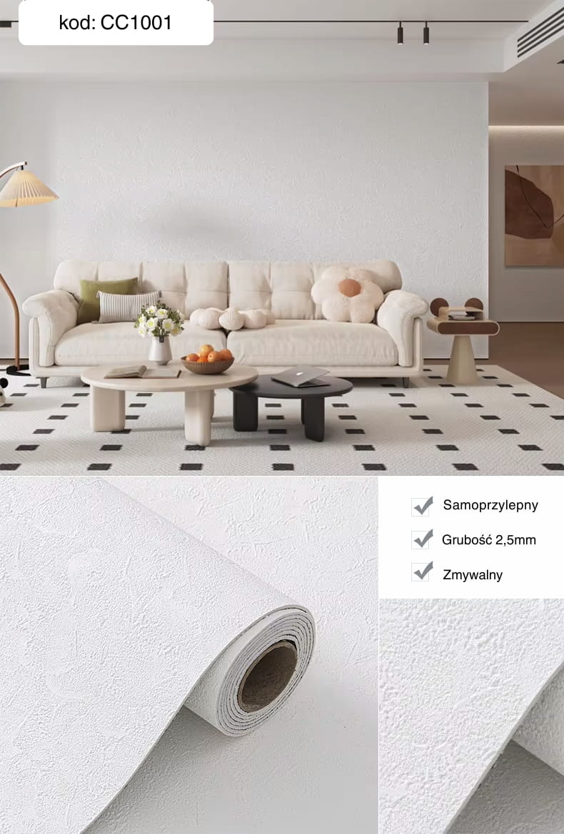 - Tapeta winylowa CC1001 w białym kolorze - samoprzylepna, strukturalna wykonana z wysokiej jakości, wielowarstwowych materiałów.