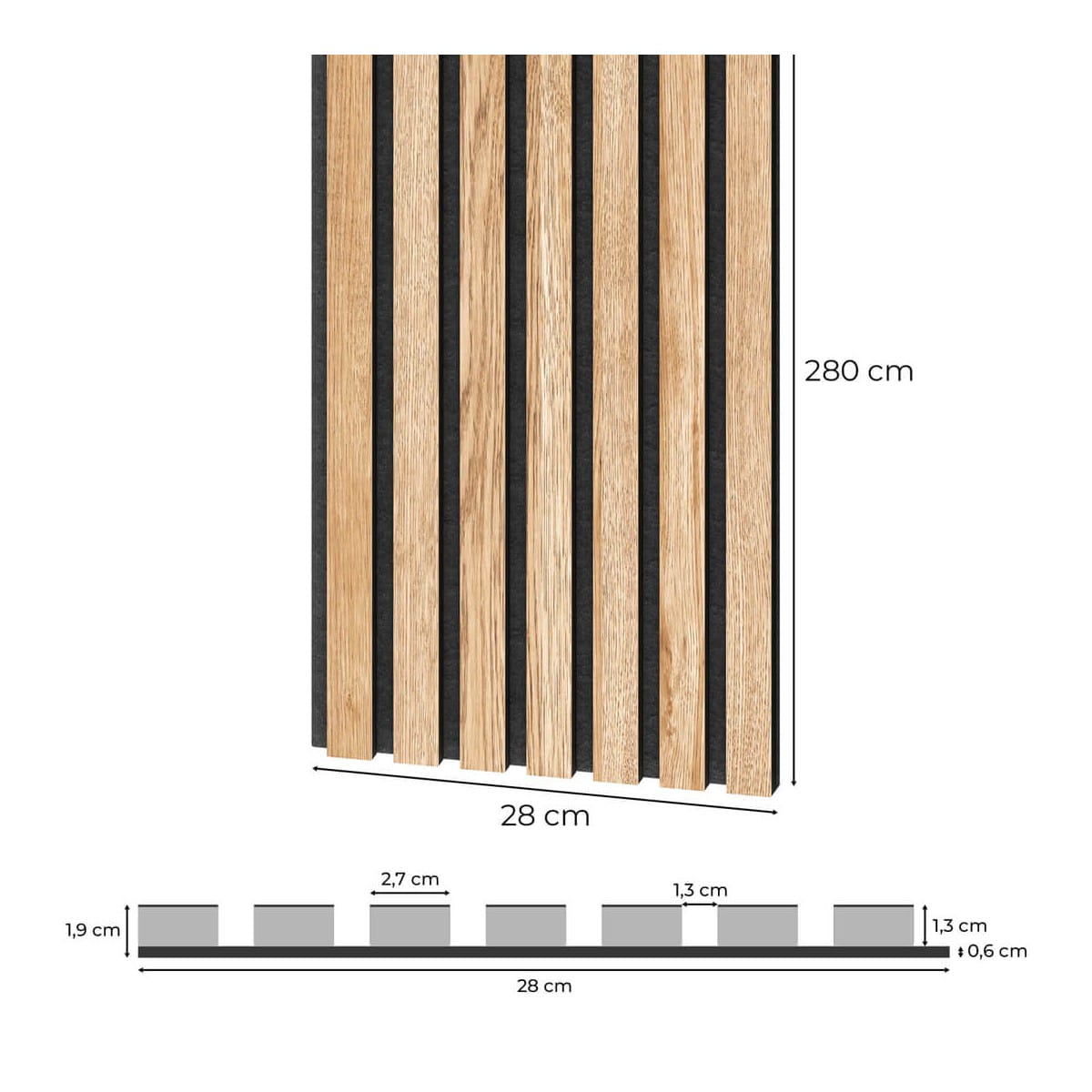 - Wymiary całkowite panelu: 28 x 1,9 x 280 cm (szer. x gł. x dł.)