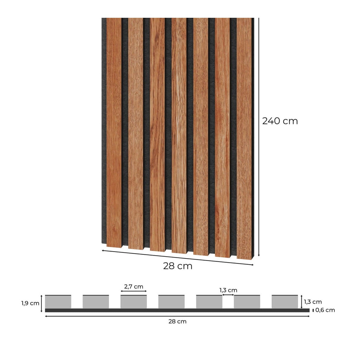 - Panel akustyczny Sapelli z lamelami o wymiarach 2,7 x 1,2 cm.