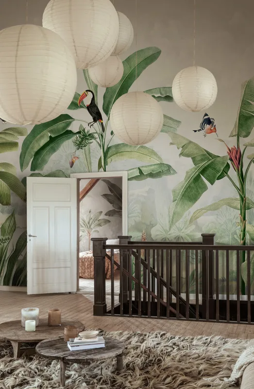 Palmy to synonim tropikalnego luksusu – ich kołyszące się sylwetki przywołują klimat dawnych egzotycznych podróży. Ten klasyczny wzór pełen jest nostalgii i elegancji, a bogata warstwowa kompozycja zachwyca detalami, które odkrywasz z każdym spojrzeniem. Wersja Birds łączy odcienie zieleni i beżu z żywymi tropikalnymi ptakami w różnych pięknych kolorach.