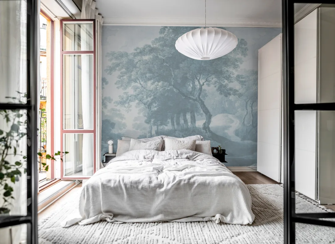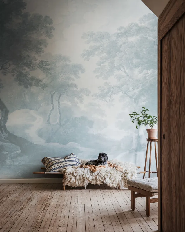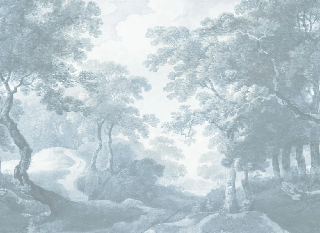 Ta tapeta przenosi na ścianę magiczny klimat leśnej polany – delikatne światło i cienie tańczą między majestatycznymi drzewami, tworząc nastrojową, kojącą scenerię. To ciepły, naturalny akcent, który otula wnętrze leśnym spokojem. Wersja kolorystyczna Blue to delikatne odcienie niebieskiego.