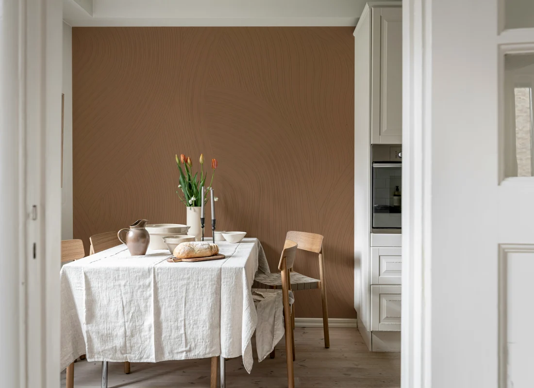 Ta tapeta powstała z ręcznie formowanej gliny, którą następnie przekształcono w wyjątkowy wzór dzięki nowoczesnej technologii druku. To doskonały przykład harmonii między tradycyjnym rzemiosłem a innowacją. Delikatne, organiczne linie mają uspokajający rytm, a naturalna faktura i kolory brązu gliny zachęca, by dotknąć powierzchni. Efekt? Niezwykle intrygujący i pełen charakteru design.