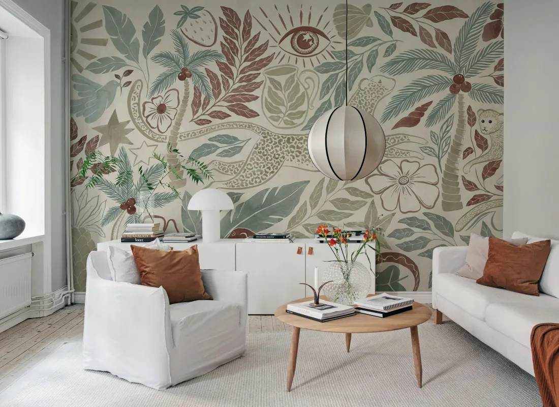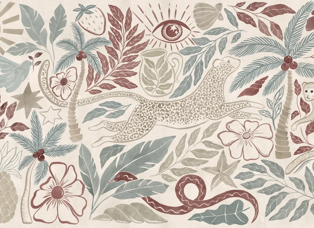 Przenieś się do pastelowej krainy snów z tapetą zaprojektowaną przez Tove Larris. Lamparty, małpki, palmy i tropikalne detale – jak gwiazdy, oczy i motywy słońca – tworzą magiczną, pełną fantazji kompozycję. Subtelna kolorystyka i bogactwo form łączą świat roślin i zwierząt w eklektyczną, artystyczną opowieść na Twoich ścianach.