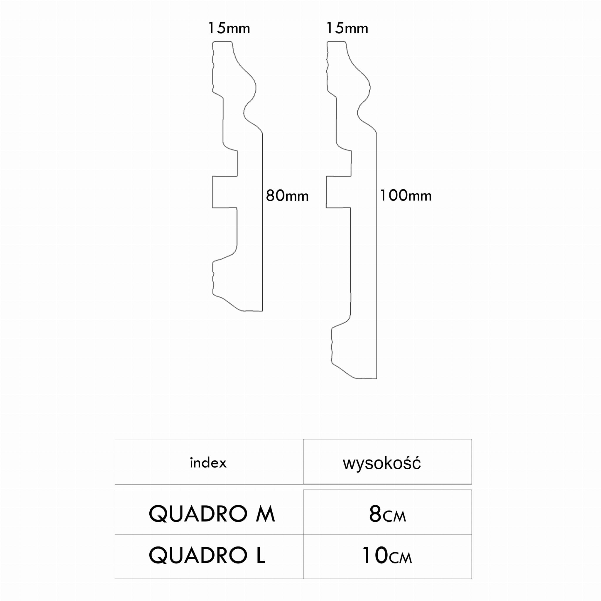 - Listwa przypodłogowa Quadro to klasyczny model z dekoracyjnym wgłębieniem i subtelną falą, który sprawdzi się w eleganckich i ponadczasowych wnętrzach.