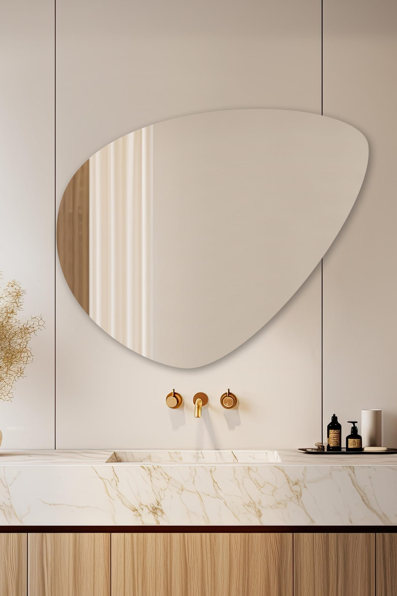 - Lustro A-1 Orbit bezramkowe lustro o nieregularnym kształcie, idealne dla miłośników eleganckiego i nowoczesnego wystroju wnętrz.