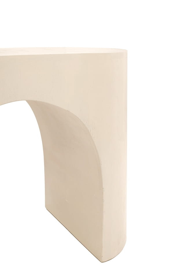 Zaokrąglona forma blatu oraz łukowate wycięcie podstawy tworzą harmonijną, rzeźbiarską sylwetkę.