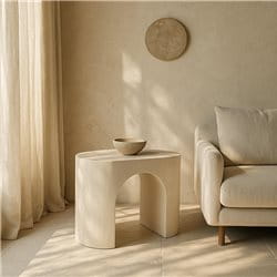 Ten beżowy stolik idealnie sprawdzi się zarówno jako element dekoracyjny, jak i funkcjonalny mebel w salonie, sypialni czy przedpokoju.