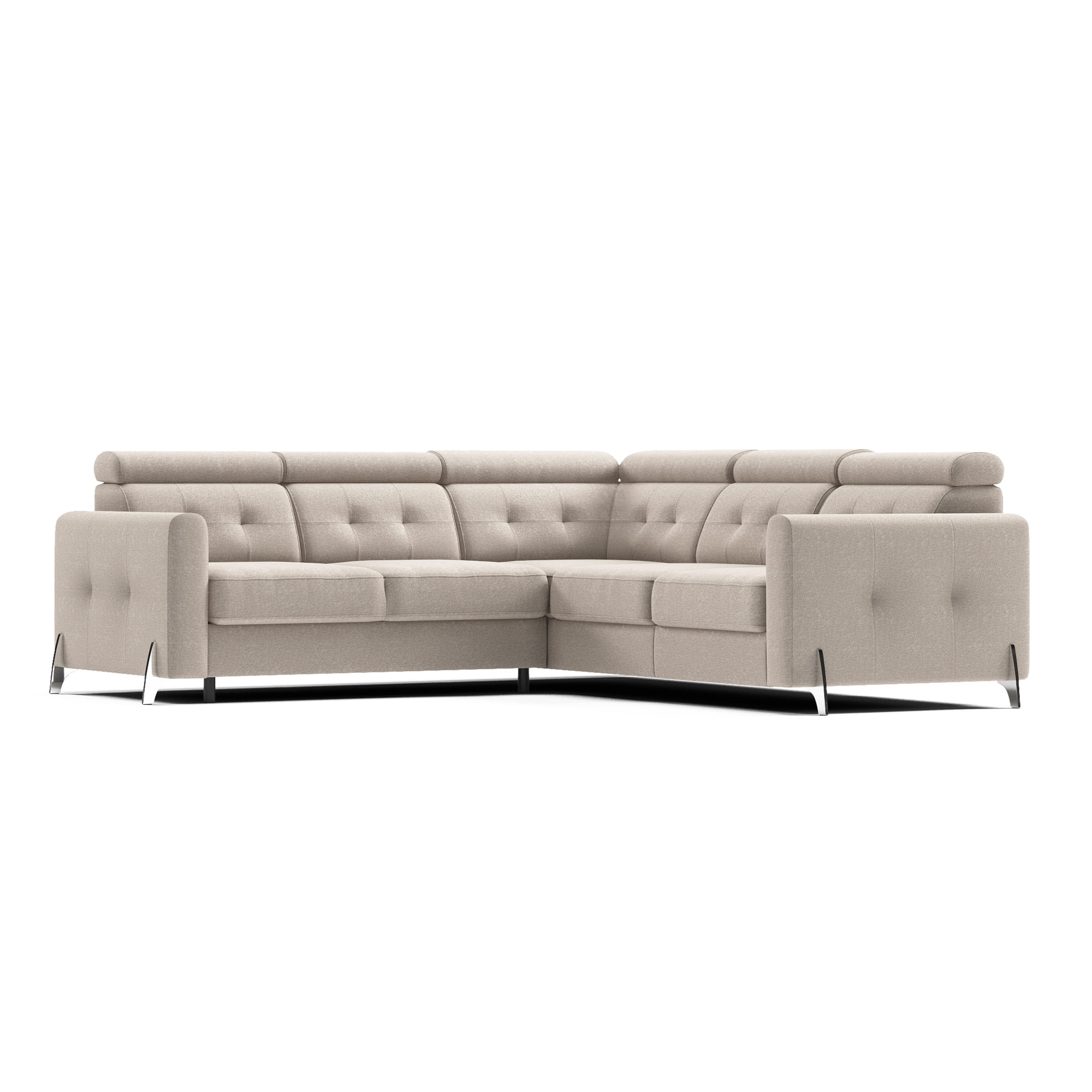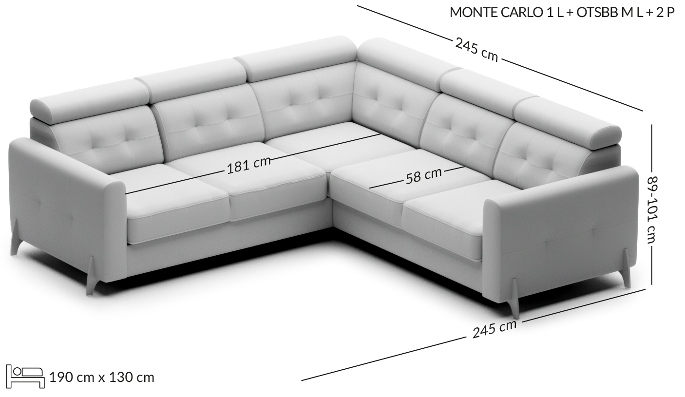 Narożnik Monte Carlo w układzie L łączy elegancką, ponadczasową bryłę z komfortem do codziennego użytkowania. Regulowane zagłówki, głębokie siedziska i staranne pikowania nadają mu wyrazistości, a lekkie, metalowe nóżki podkreślają nowoczesny charakter.