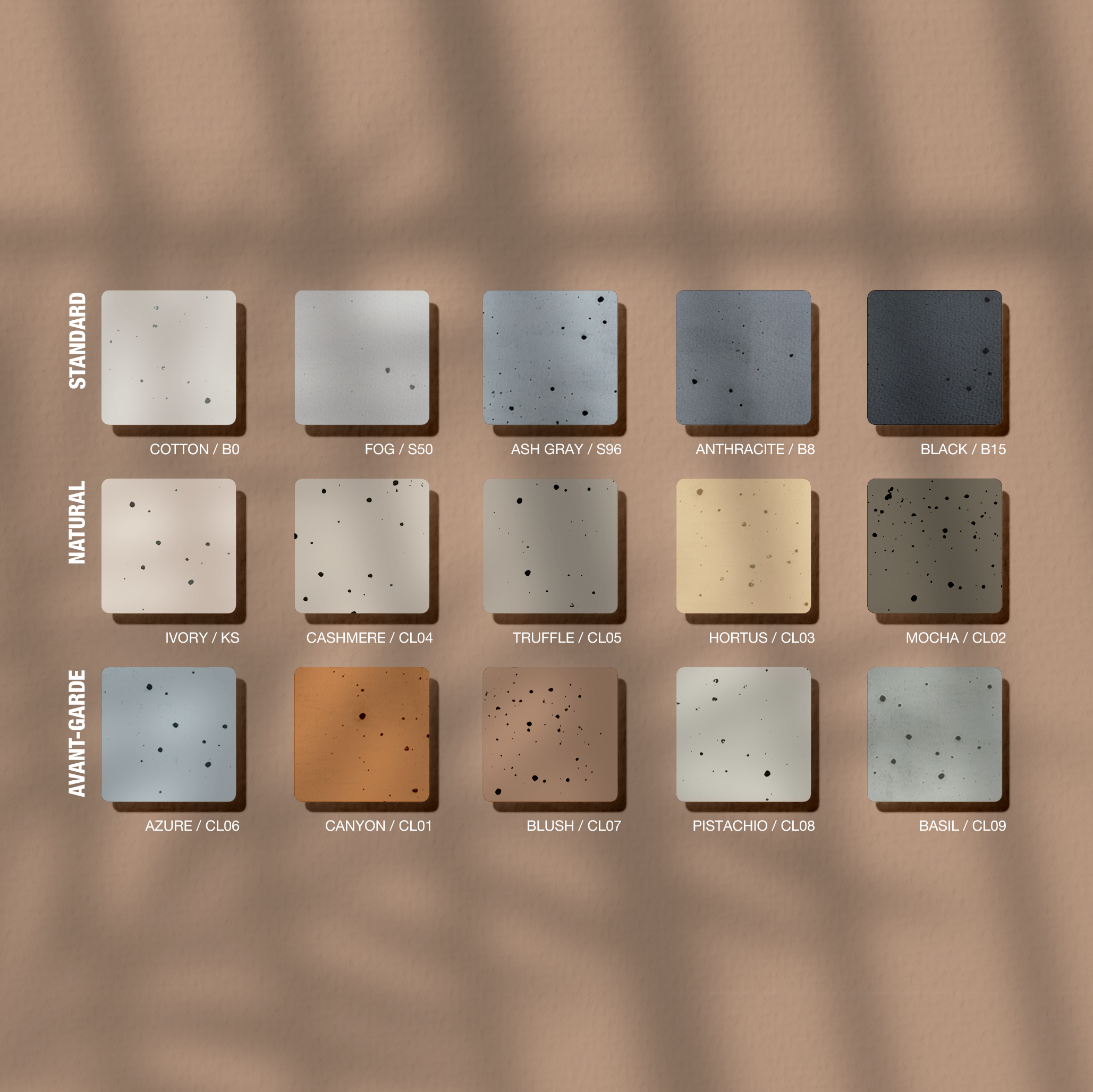 Dopłata: Anthracite (B08), Black (B15), Cashmere (CL04), Truffle (CL05), Hortus (CL03), Mocha (CL02), Azure (CL06), Canyon (CL01), Blush (CL07), Pistachio (CL08), Basil (CL09)