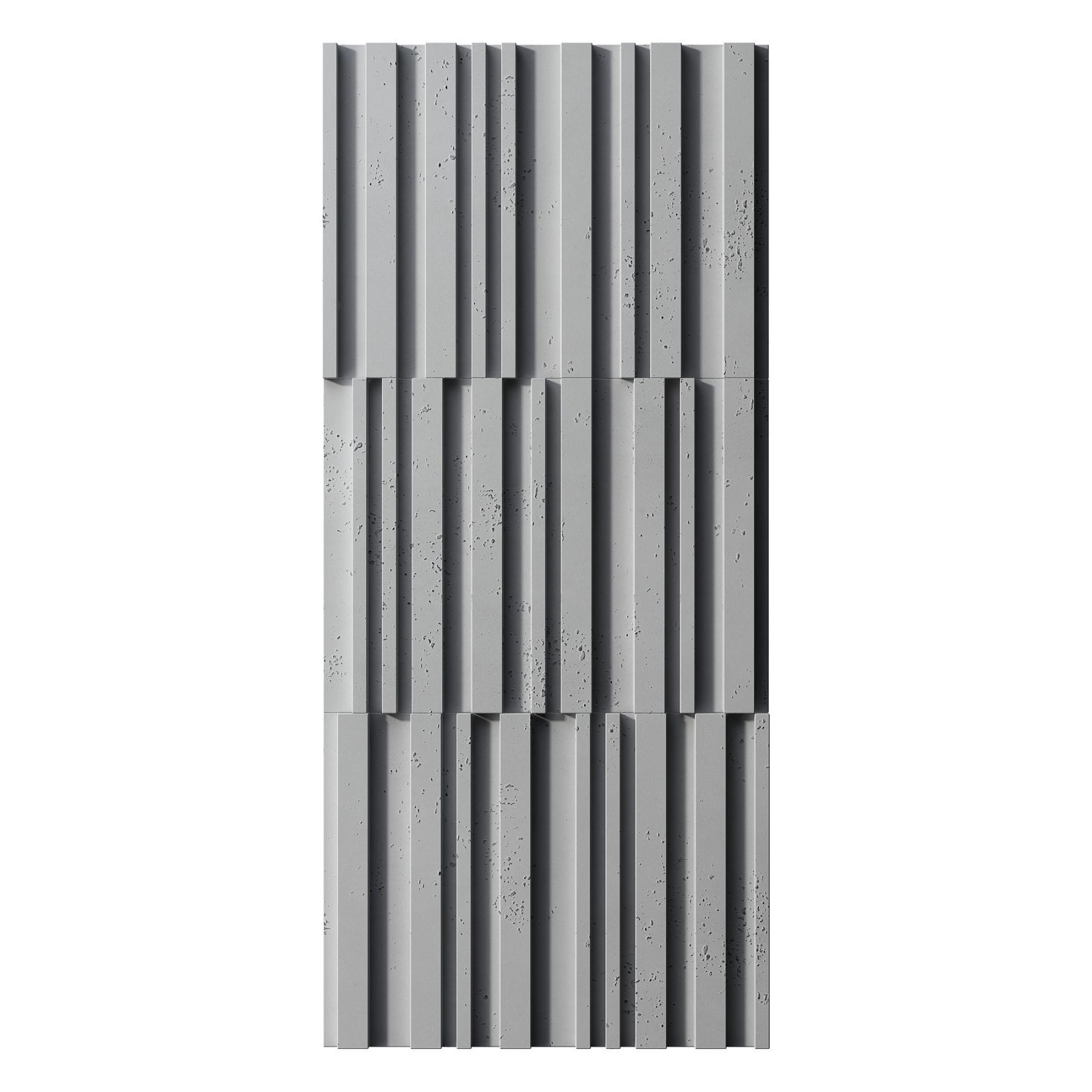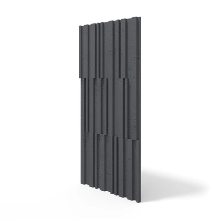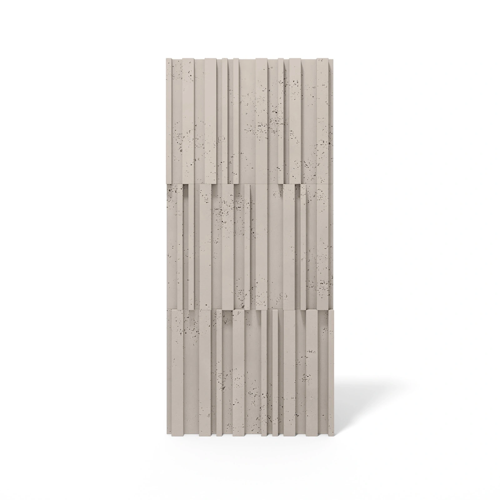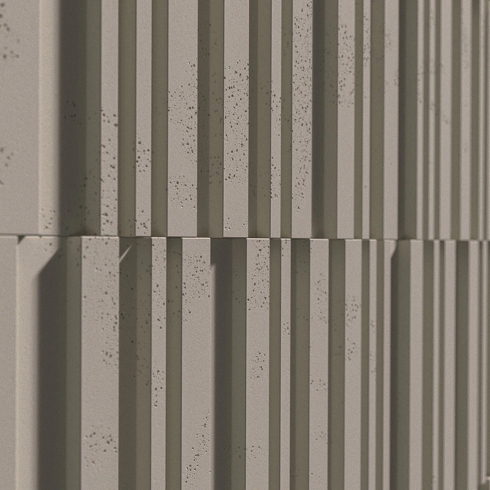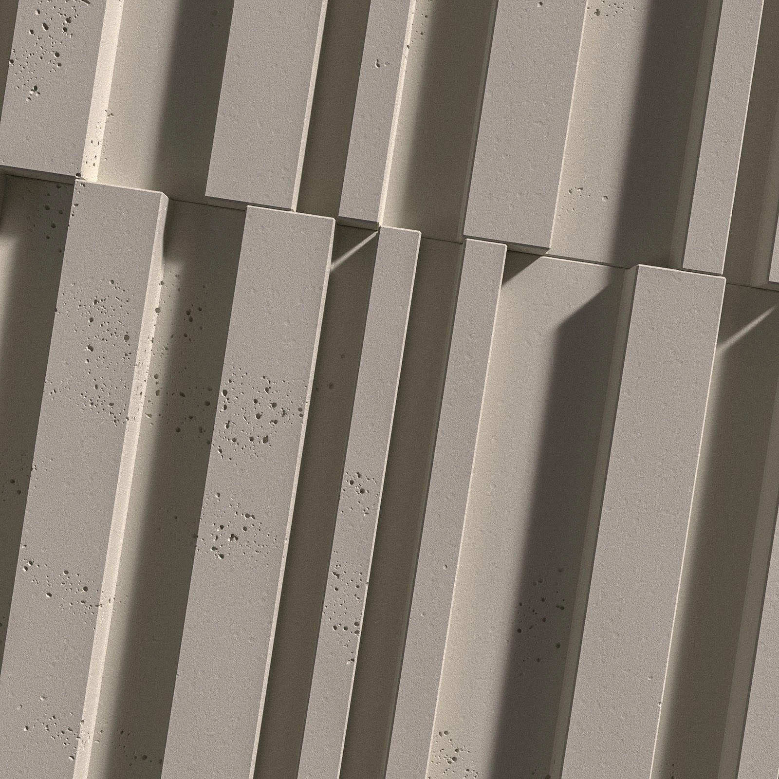 - Panel betonowy posiada różne grubości elementów, które tworzą wyrazisty efekt 3D, nadając ścianie dynamicznego i atrakcyjnego wyglądu.