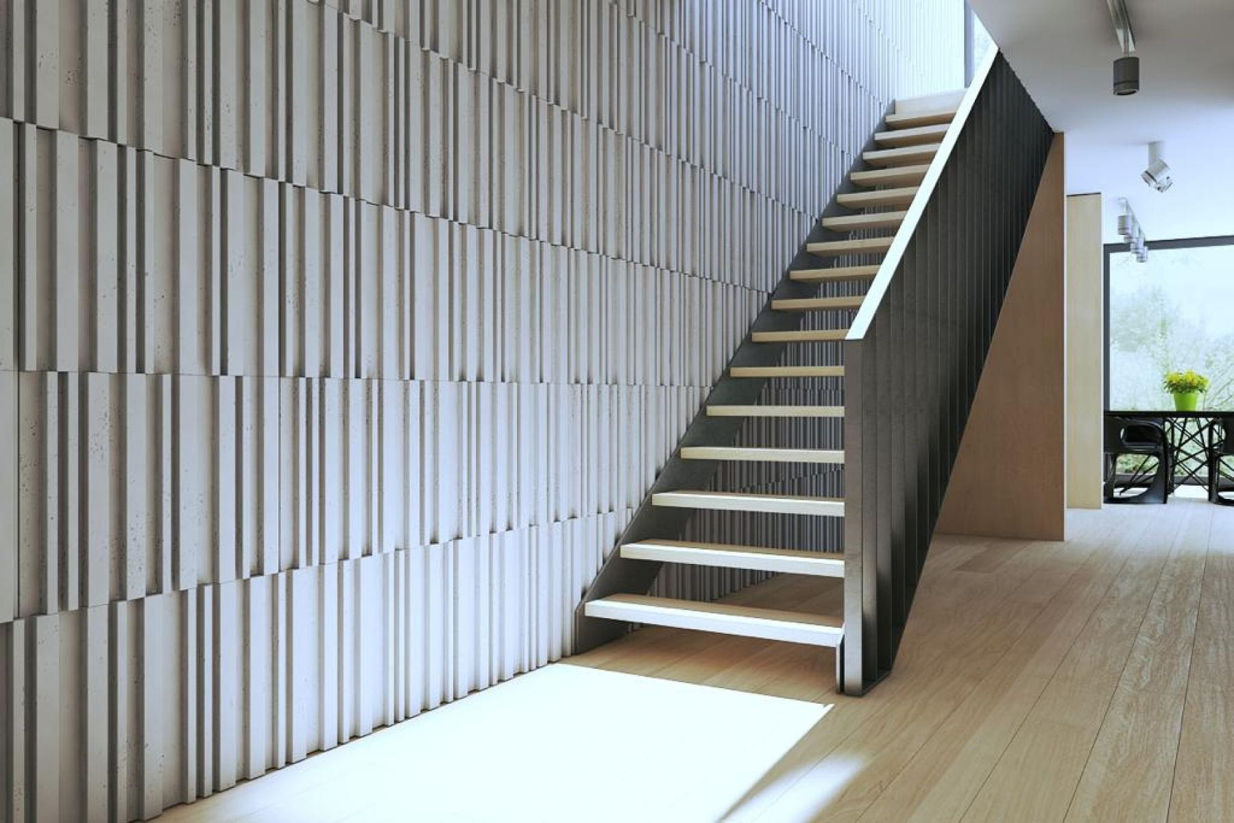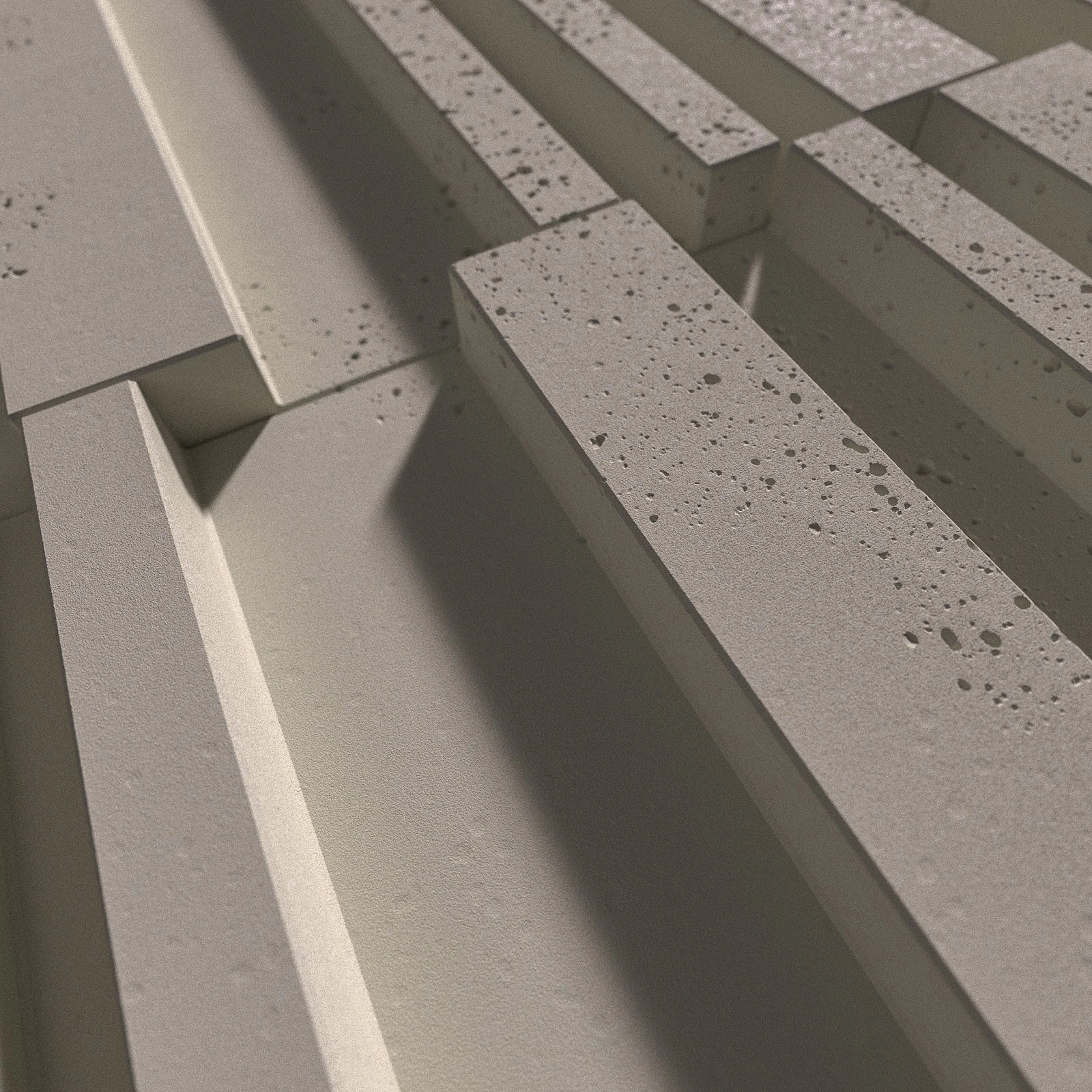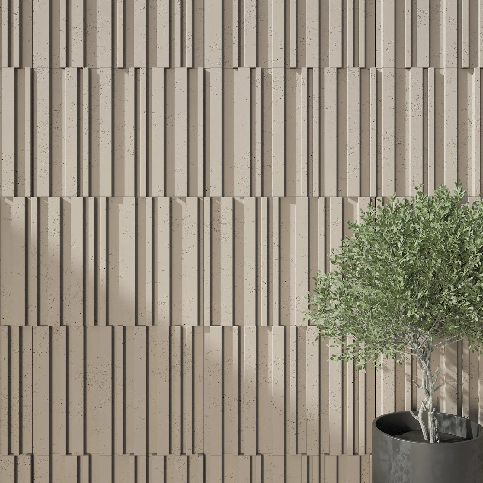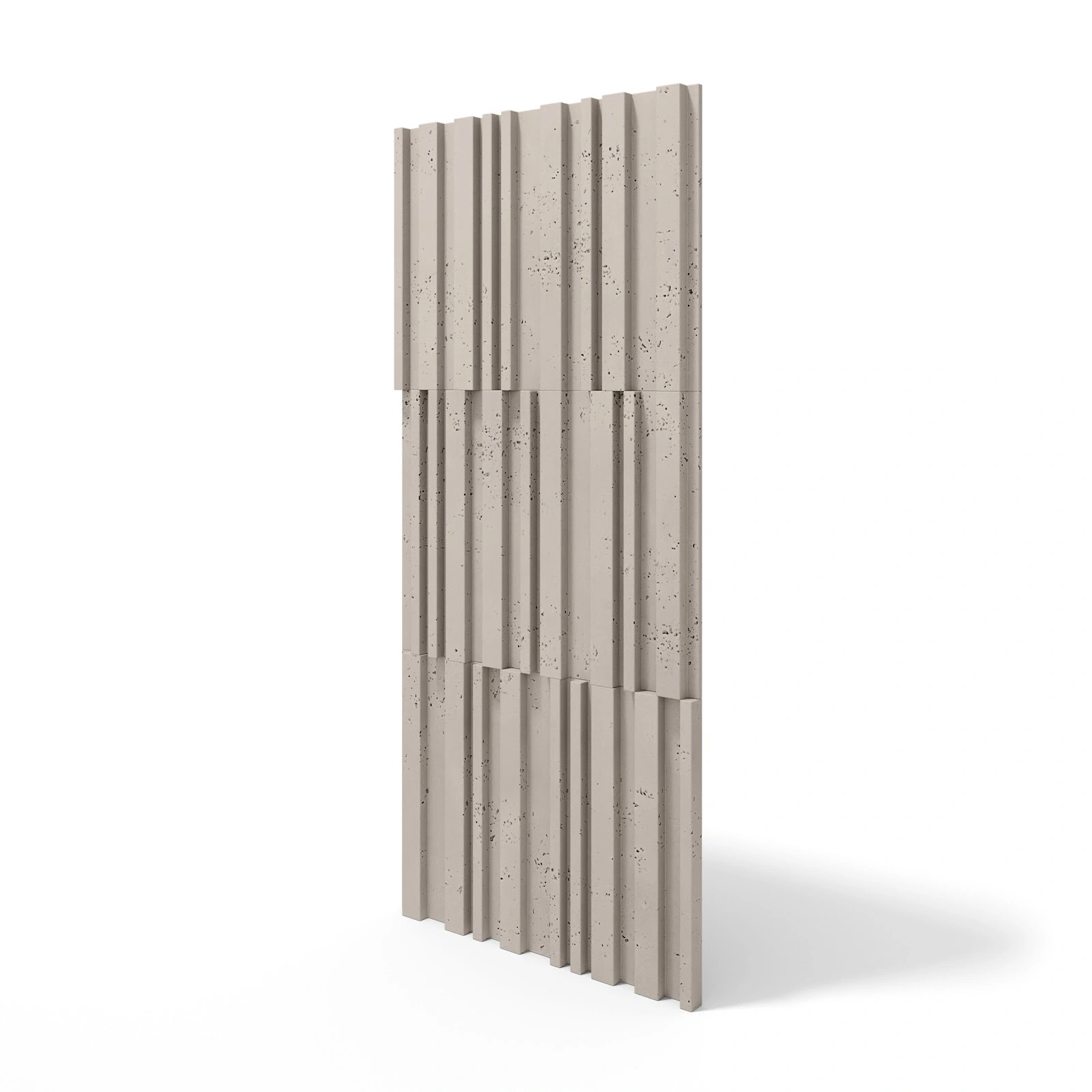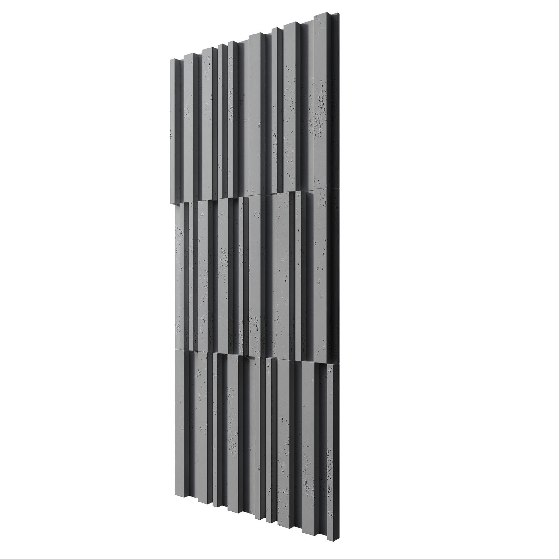 - Panel betonowy posiada różne grubości elementów, które tworzą wyrazisty efekt 3D, nadając ścianie dynamicznego i atrakcyjnego wyglądu.