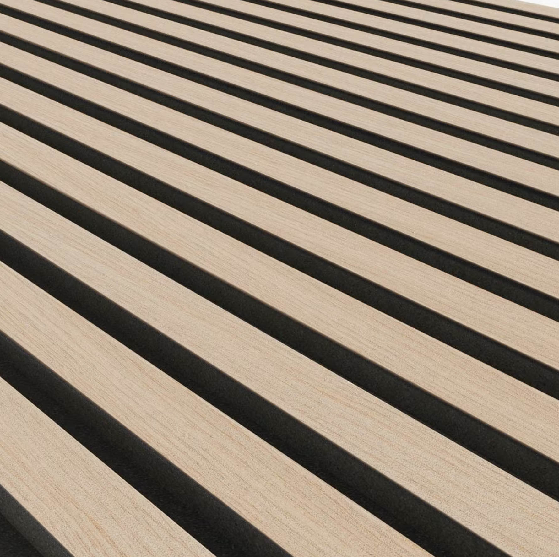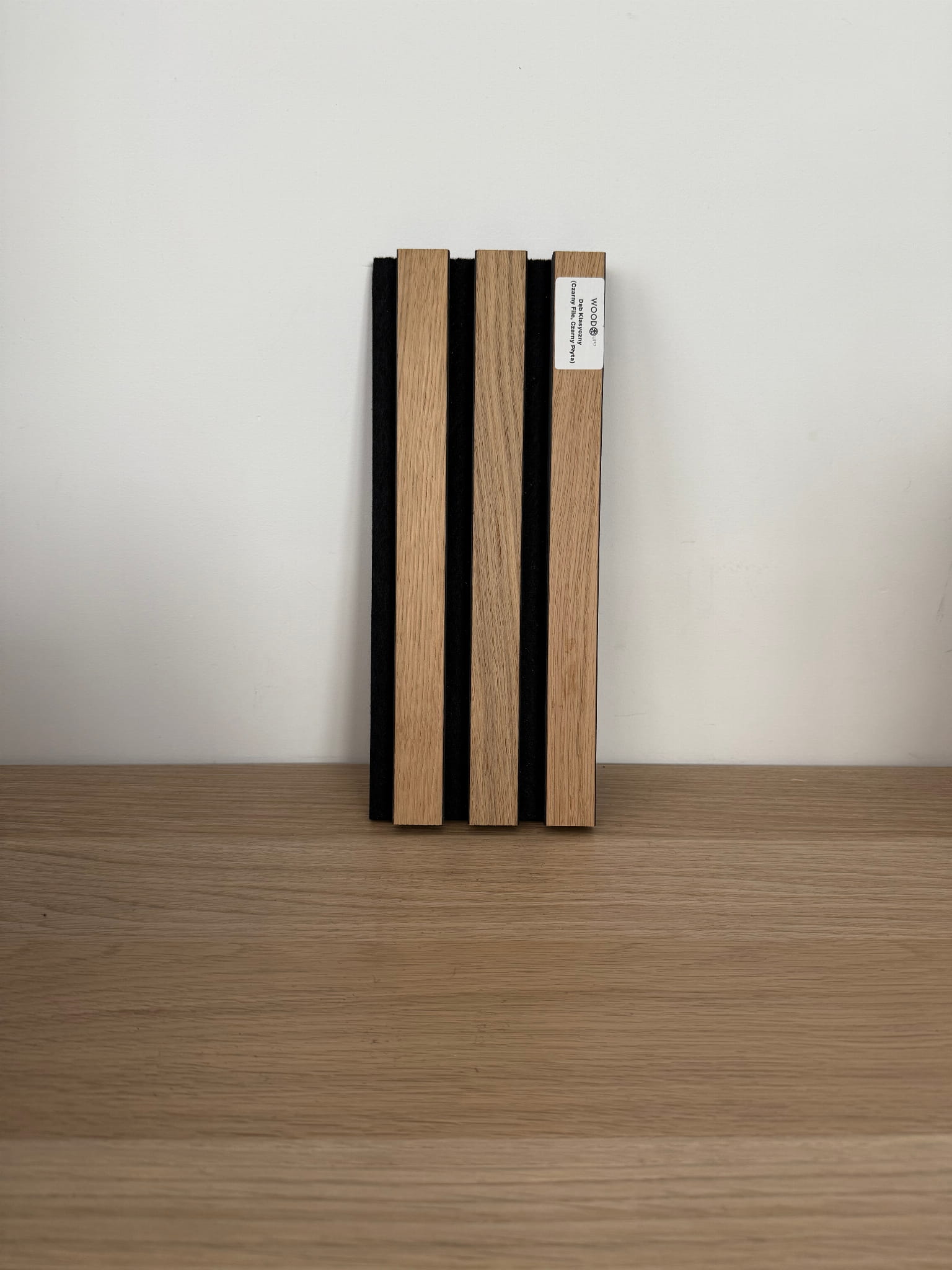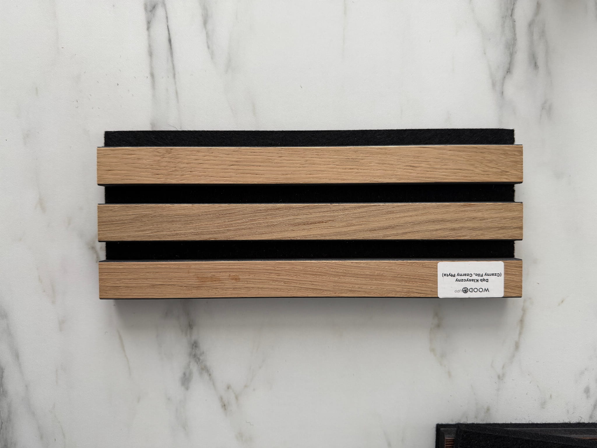 - Panel składa się z ozdobnych lameli w odcieniu dębu klasycznego, boki barwione na czarno, osadzonych na 9 mm filcu akustycznym w kolorze beżowym.