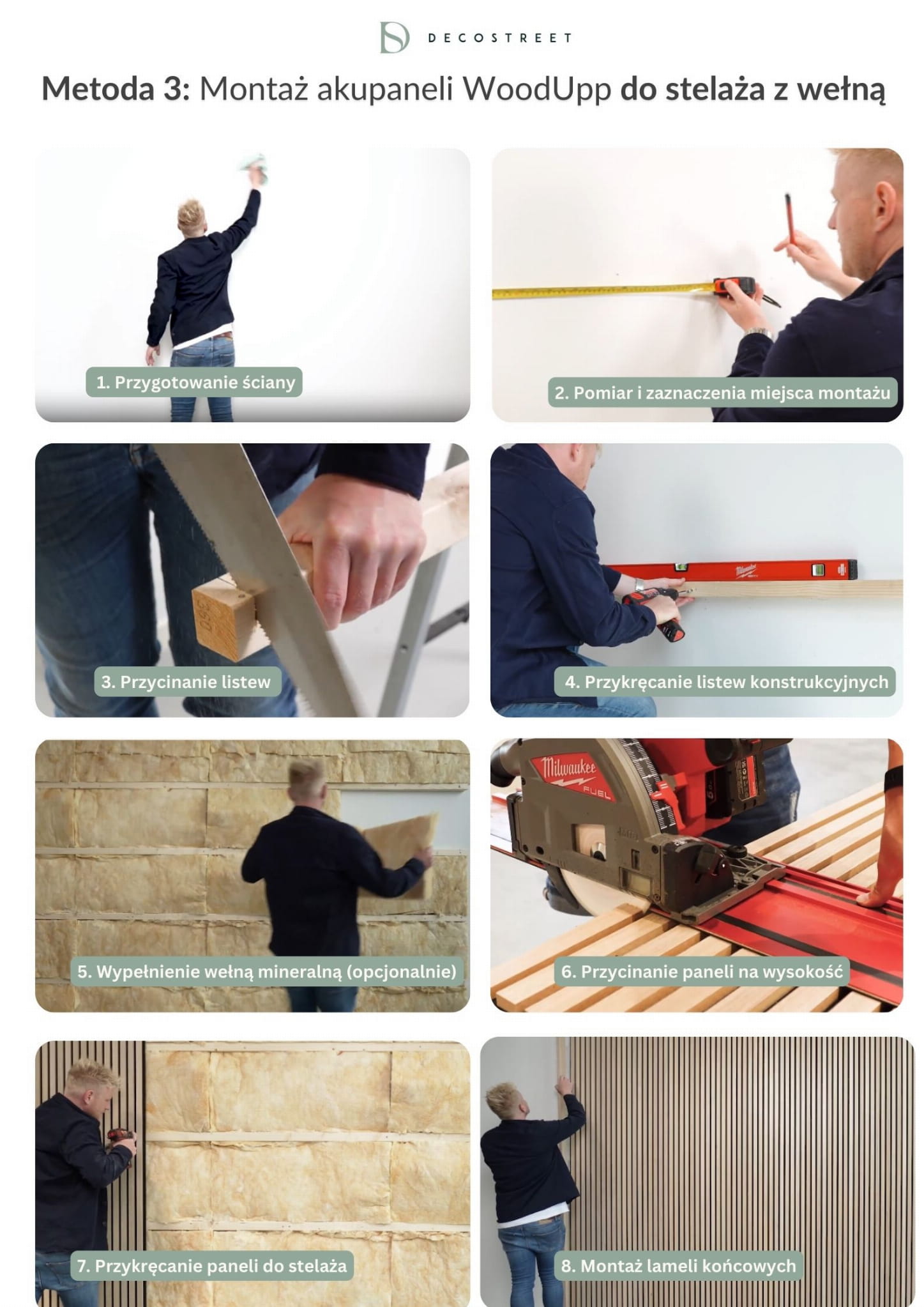- Aby uzyskać najlepsze właściwości akustyczne, wypełnij przestrzeń między listwami wełną mineralną (opcjonalne).