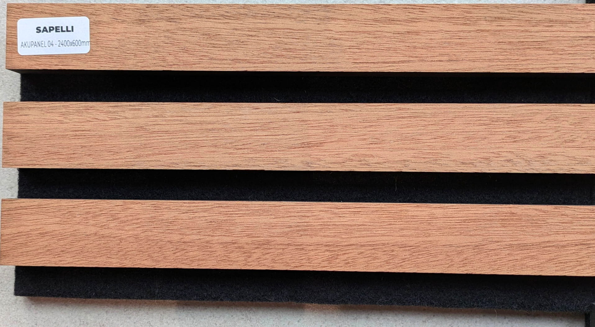 Panel akustyczny Sapelli to dekoracyjne lamele wykonane z naturalnego forniru nieolejowanego, osadzone na czarnym filcu akustycznym o grubości 7 mm. Panel łączy elegancki wygląd naturalnego drewna z funkcją poprawy akustyki wnętrza.
