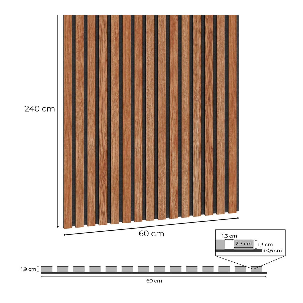 - Wymiary całkowite panelu: 60 x 1,9 x 240 cm (szer. x gł. x dł.)