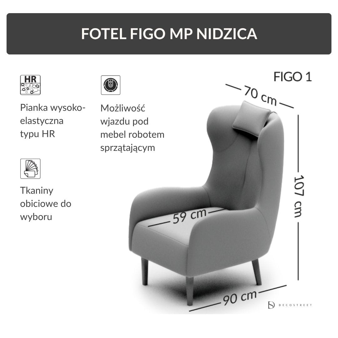 Zestaw Figo to fotel o smukłej, lekkiej sylwetce z wysokim, profilowanym oparciem oraz dopasowana pufa, która pozwala wygodnie ułożyć nogi. Miękkie linie, zaokrąglone podłokietniki i subtelne przeszycia nadają całości przytulny, nowoczesny charakter. Drewniane nogi dostępne w kilku kolorach do wyboru podkreślają elegancję bryły i ułatwiają dopasowanie zestawu do różnych aranżacji. Wbudowana poduszka zagłówkowa zwiększa komfort podparcia karku podczas dłuższego relaksu.