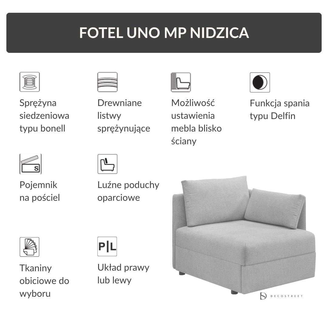 - Fotel rozkładany UNO to praktyczny mebel 2 w 1 – fotel dzienny i łóżko nocne.