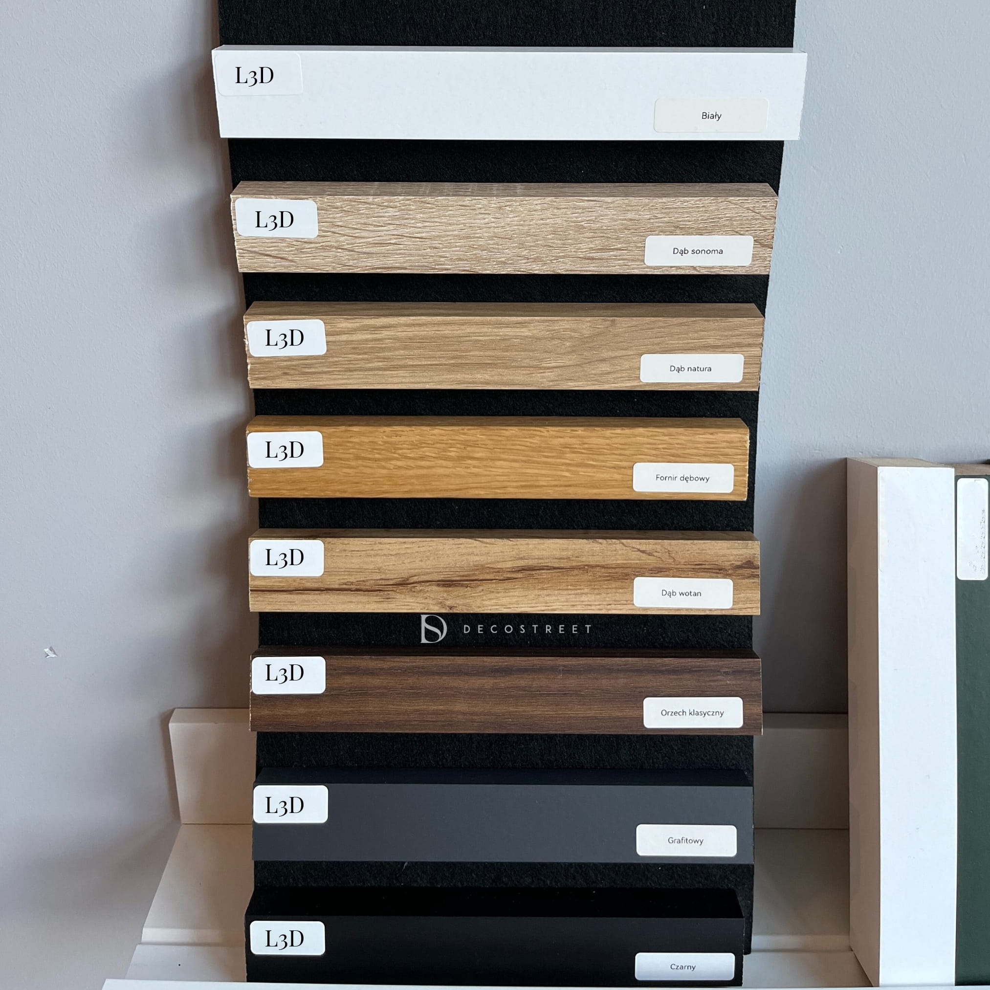 - Lamele Slim 3x1,8 cm w kolorze dąb sonoma zamontowane na szarym filcu - spójna i nowoczesna dekoracja ścienna lub sufitowa.