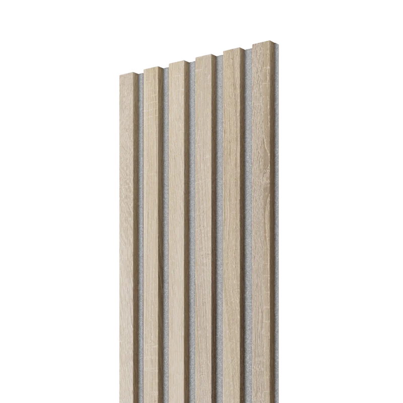 Lamele Slim Dąb Sonoma L3D na szarym filcu to gotowy panel dekoracyjno-akustyczny do wnętrz. Kompozycja składa się z lameli o wymiarze 3x1,8x275 cm, zamocowanych na szarym filcu o grubości 8 mm. Cały panel ma wymiar 30x2,6x275 cm, dzięki czemu stanowi wygodne i efektowne rozwiązanie do aranżacji ścian oraz sufitów. Wybarwienie dąb sonoma w połączeniu z szarym tłem prezentuje się elegancko, nowocześnie i pasuje zarówno do wnętrz domowych, jak i komercyjnych.