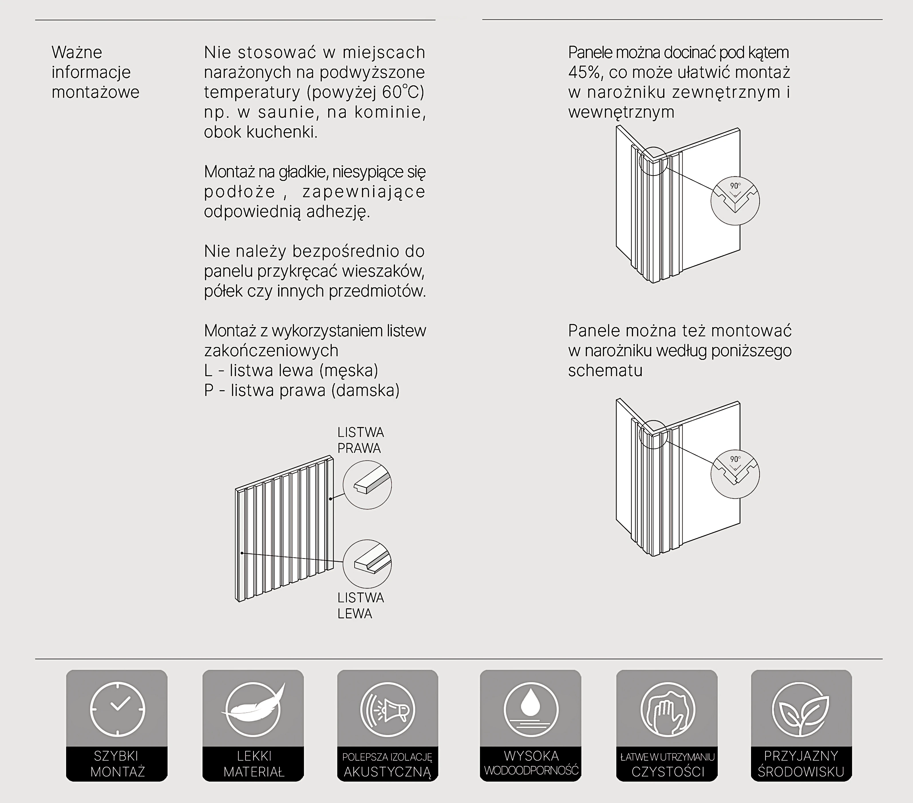- Panel wykonany jest z nowoczesnego polistyrenu (PS), który jest odporny na ścieranie, zabrudzenia i wilgoć, a przy tym nie wymaga impregnacji.