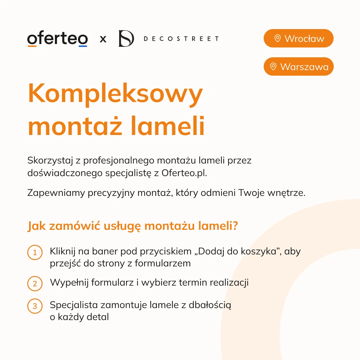 - Elastyczny sposób montażu pozwala na aranżację lameli w pionie lub poziomie, tworząc kompozycje dopasowane do charakteru wnętrza.