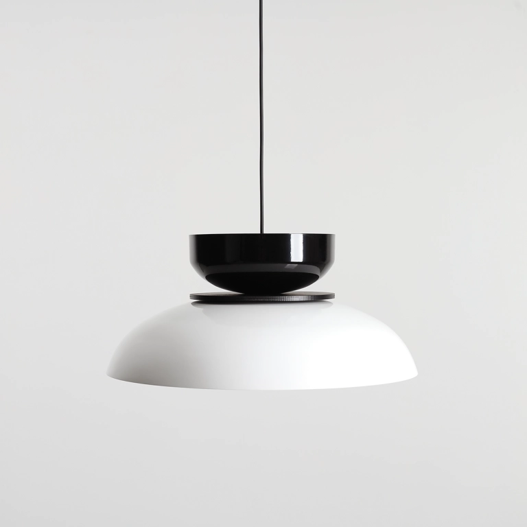 - Klosze o dwóch rozmiarach (średnice 47 cm i 23 cm), wykonane w głębokiej czerni i bieli, o połyskującym wykończeniu, współgrają z ciemnym przewodem i drewnianym elementem, tworząc wyrazistą, nowoczesną formę.