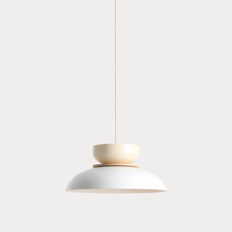 - Klosze o dwóch rozmiarach (średnice 47 cm i 23 cm), wykonane w bieli o połyskującym wykończeniu i kremowym kolorze, współgrają z jasnym przewodem i drewnianym dyskiem, tworząc wyrazistą, nowoczesną formę.