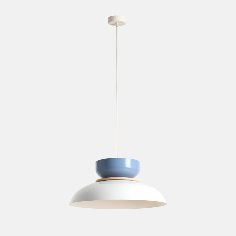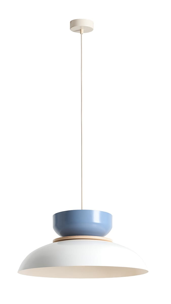 - Klosze o dwóch rozmiarach (średnice 47 cm i 23 cm), wykonane w bieli o połyskującym wykończeniu i modnym, pastelowym niebieskim kolorze, współgrają z jasnym przewodem i drewnianym dyskiem, tworząc wyrazistą, nowoczesną formę.