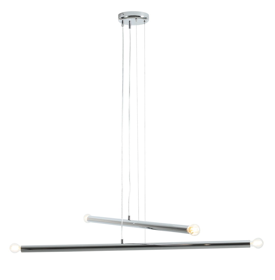 - Lampa wisząca Tubo 4 Chrome złożona jest z 2 poziomych, skrzyżowanych ze sobą drążków w kolorze srebrnym oraz 4 małych kloszy. Klosze umieszczone są po obu stronach każdego drążka.