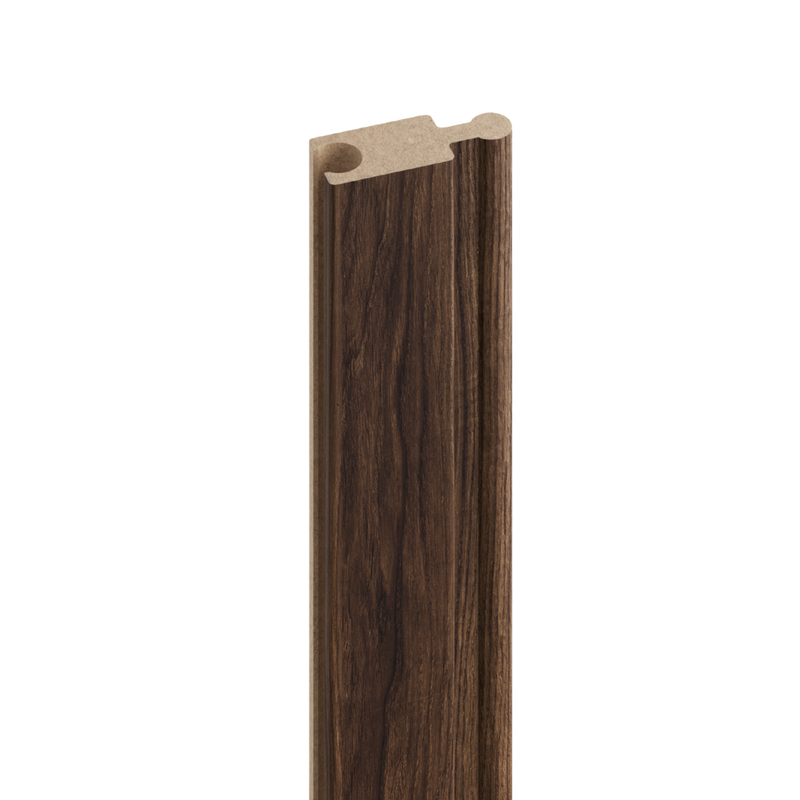 Lewa listwa zakończeniowa do lameli Flex L3D w kolorze orzech klasyczny to elegancki element wykończeniowy, który pozwala estetycznie domknąć dekorację po lewej stronie. Głęboki, ciemny odcień drewna inspirowany klasycznym orzechem nadaje wnętrzu prestiżowy i ponadczasowy charakter, zapewniając spójny efekt na ścianach oraz sufitach.