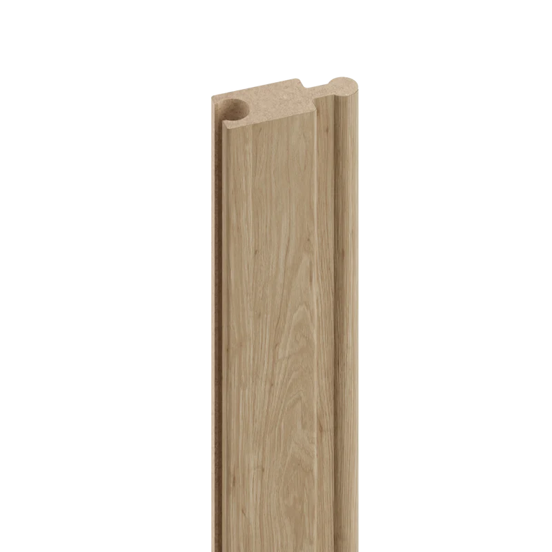 Lewa listwa zakończeniowa do lameli Flex L3D w kolorze dąb natura to estetyczny element wykończeniowy, który pozwala elegancko domknąć dekorację po lewej stronie. Neutralny, jasny odcień drewna wprowadza do wnętrza ciepło i harmonię, zapewniając spójny i ponadczasowy efekt na ścianach oraz sufitach.