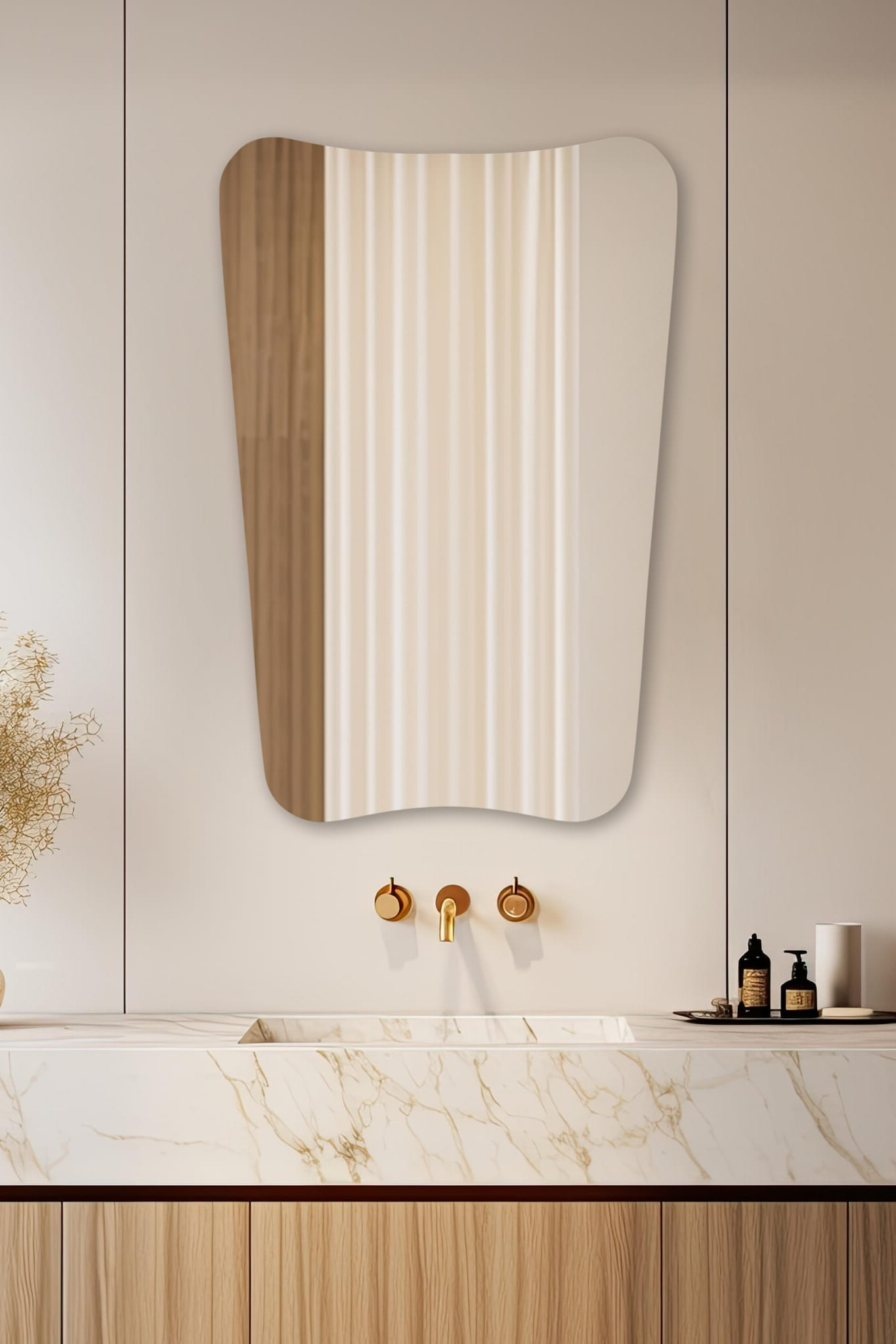 - Lustro ma kształt nieregularnego prostokąta z zaokrąglonymi narożnikami i falistymi bokami. Ten kształt nadaje mu nowoczesny i oryginalny wygląd, idealnie pasujący do stylowych, współczesnych wnętrz.