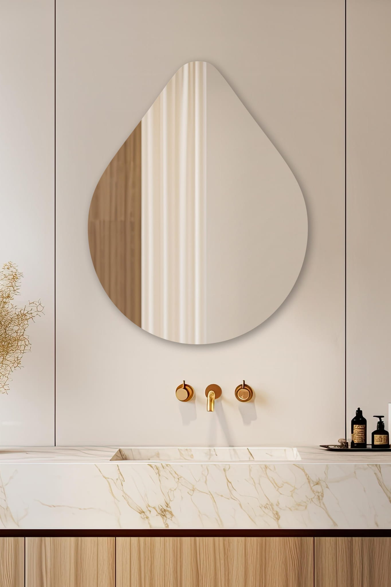 - Lustro A-1 Łezka to bezramkowe lustro o nieregularnym kształcie, idealne dla miłośników eleganckiego i nowoczesnego wystroju wnętrz.