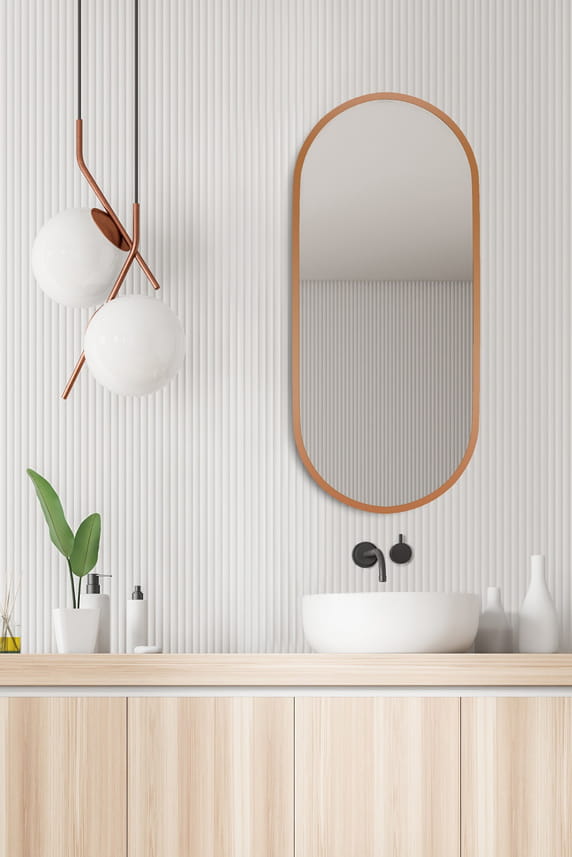 Rama w kolorze miedzi, o delikatnie zaokrąglonym kształcie harmonijnie komponuje się i podkreśla dodatki w łazience, przedpokoju czy sypialni.
