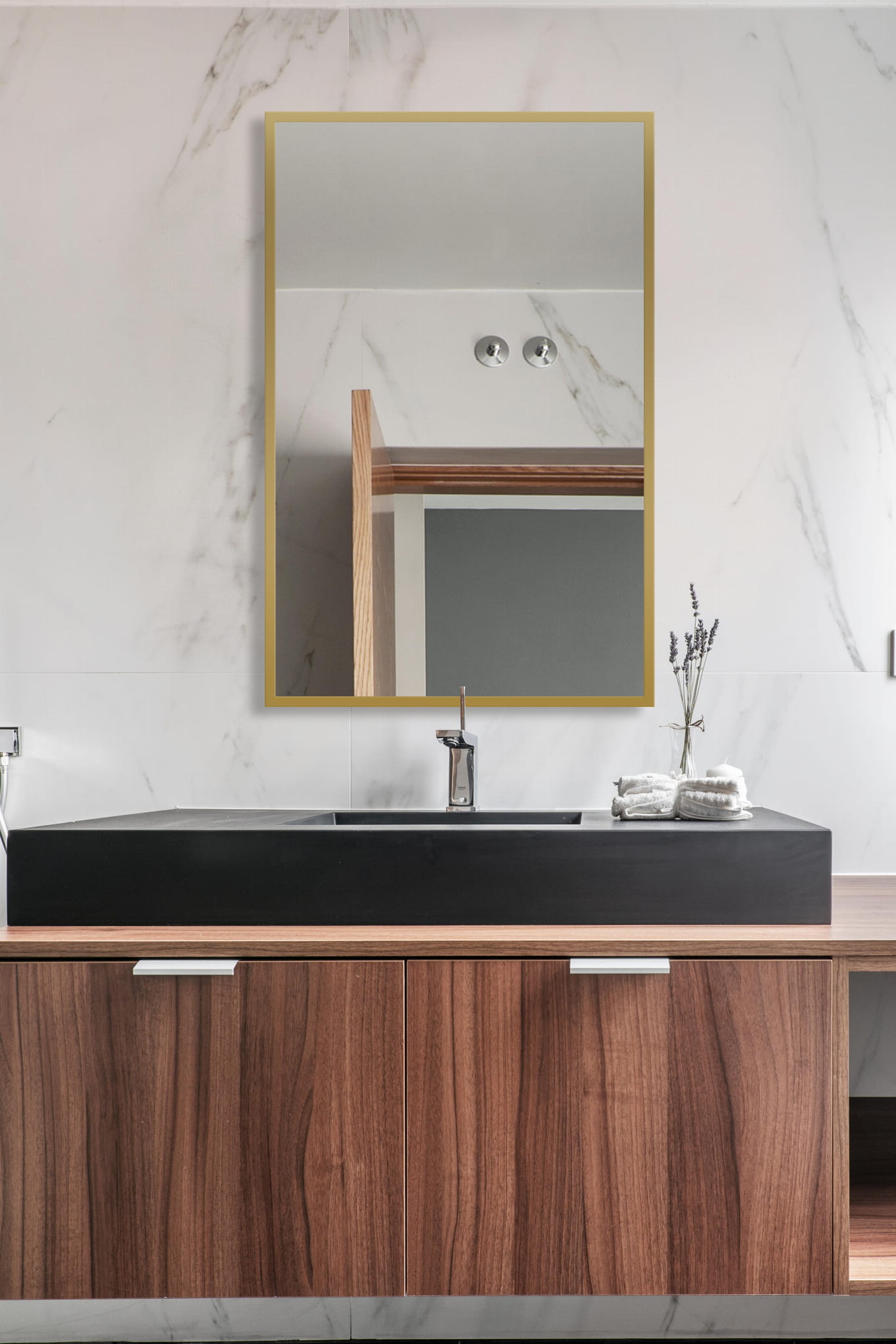 - Rama w złotym kolorze harmonijnie komponuje się i podkreśla dodatki w łazience, przedpokoju czy sypialni.