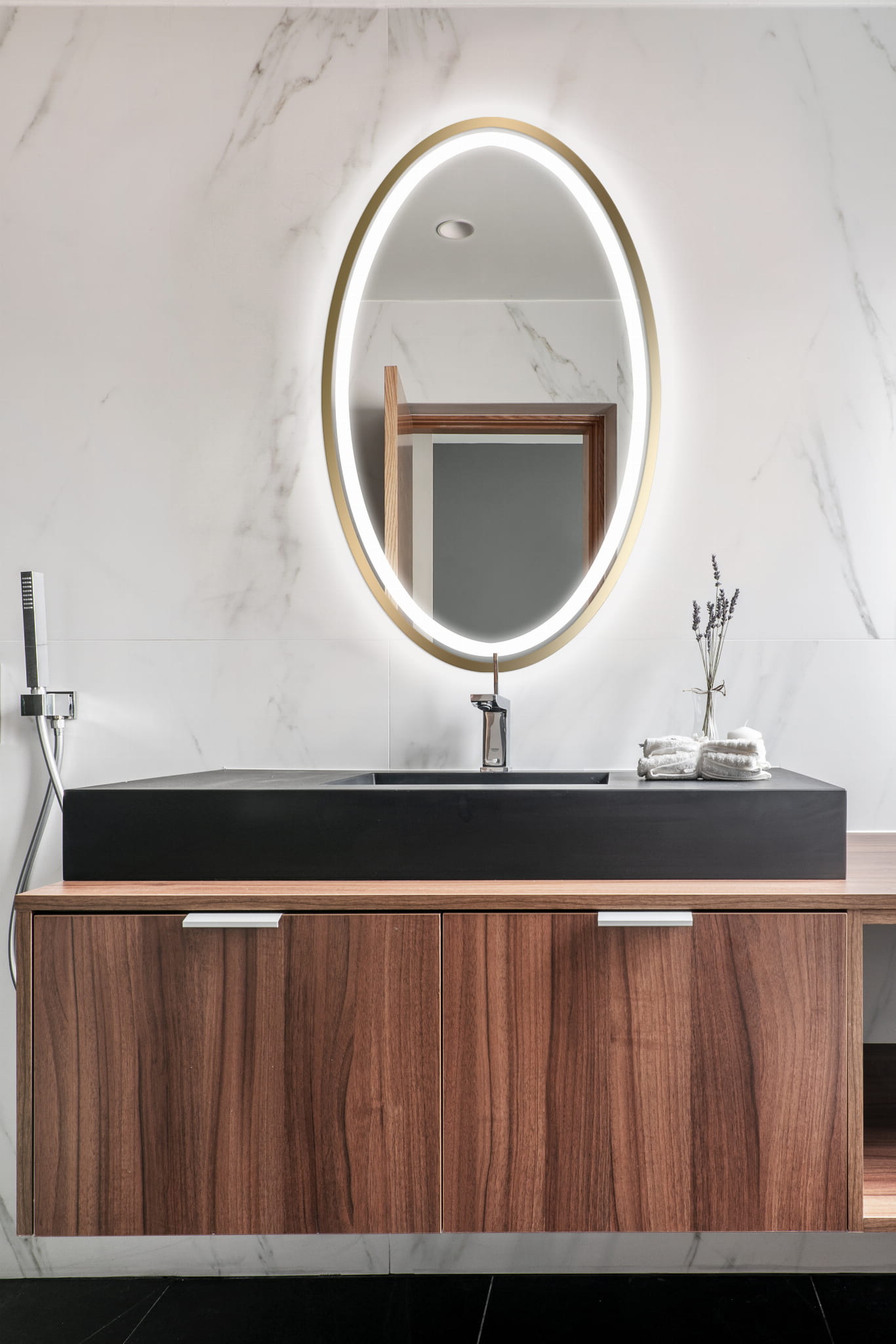 Model Puro oferuje dwa rodzaje podświetlenia: oświetlenie twarzy oraz nastrojowe światło ambientowe, tworząc subtelną poświatę za lustrem. Przednie podświetlenie ułatwia wykonywanie makijażu i codzienną pielęgnację, a zewnętrzne oświetlenie podkreśla strukturę ściany i dodaje wnętrzu przytulnego klimatu.