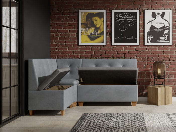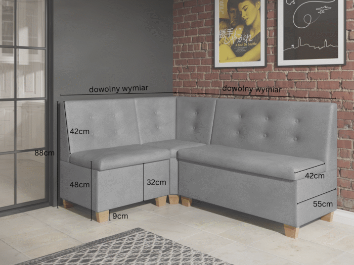 Narożnik kuchenny Walencja to propozycja dla osób, które cenią wygodę, funkcjonalność i dopracowany design. Model wyróżnia się prostą, elegancką formą z subtelnym pikowaniem, które nadaje mu nowoczesnego, ale przytulnego charakteru. Dzięki możliwości dopasowania wymiarów oraz wyboru strony narożnika, bez problemu wkomponuje się zarówno w mniejsze kuchnie, jak i większe jadalnie. Dodatkowym atutem są pojemne schowki pod siedziskiem, które pomagają utrzymać porządek i maksymalnie wykorzystać przestrzeń.
