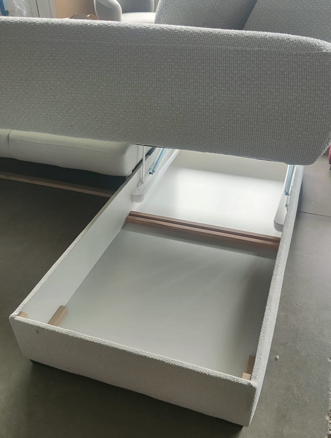 - Pojemnik na pościel – pojemny schowek w szezlongu pozwala na wygodne przechowywanie koców i poduszek.