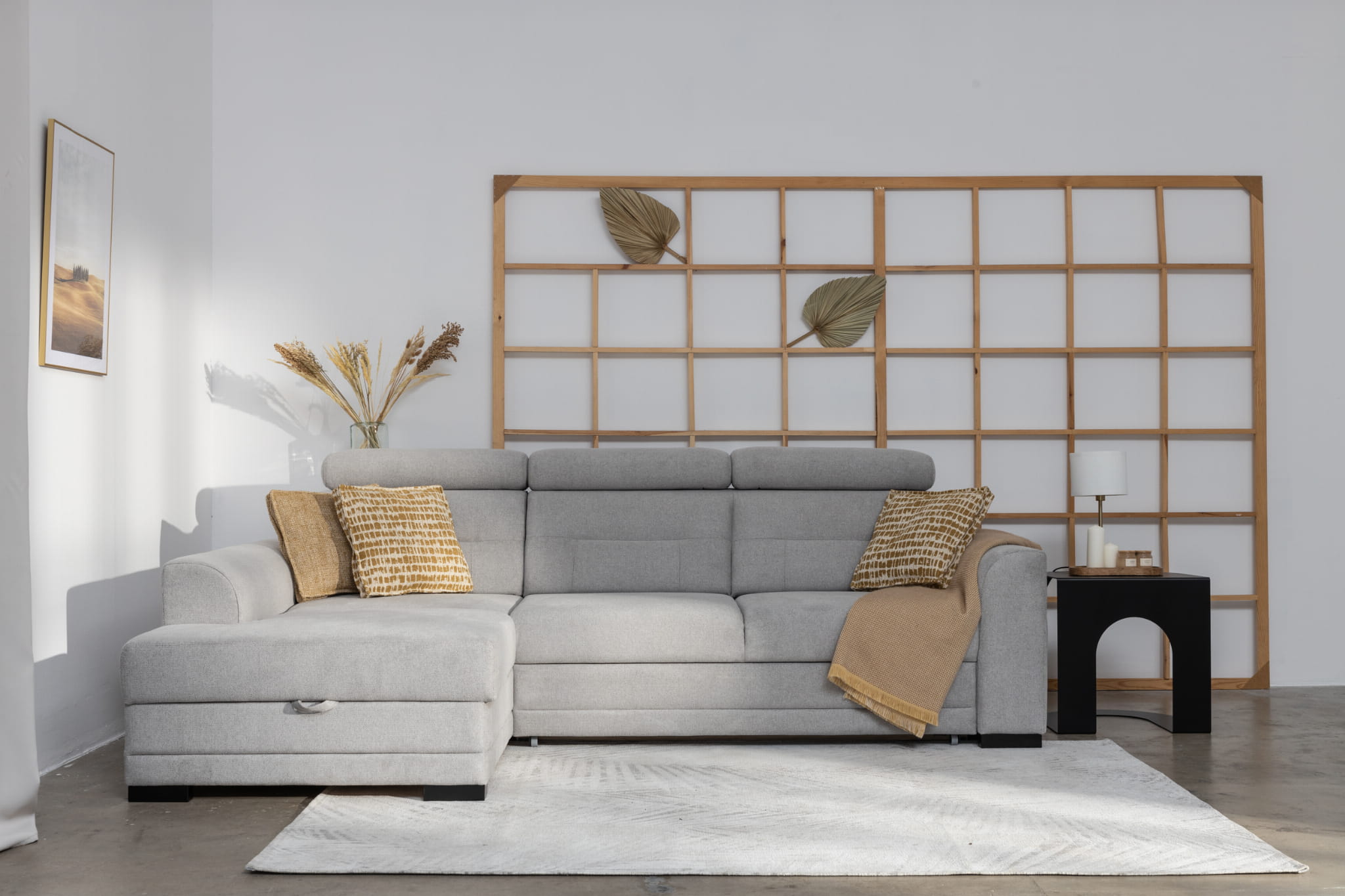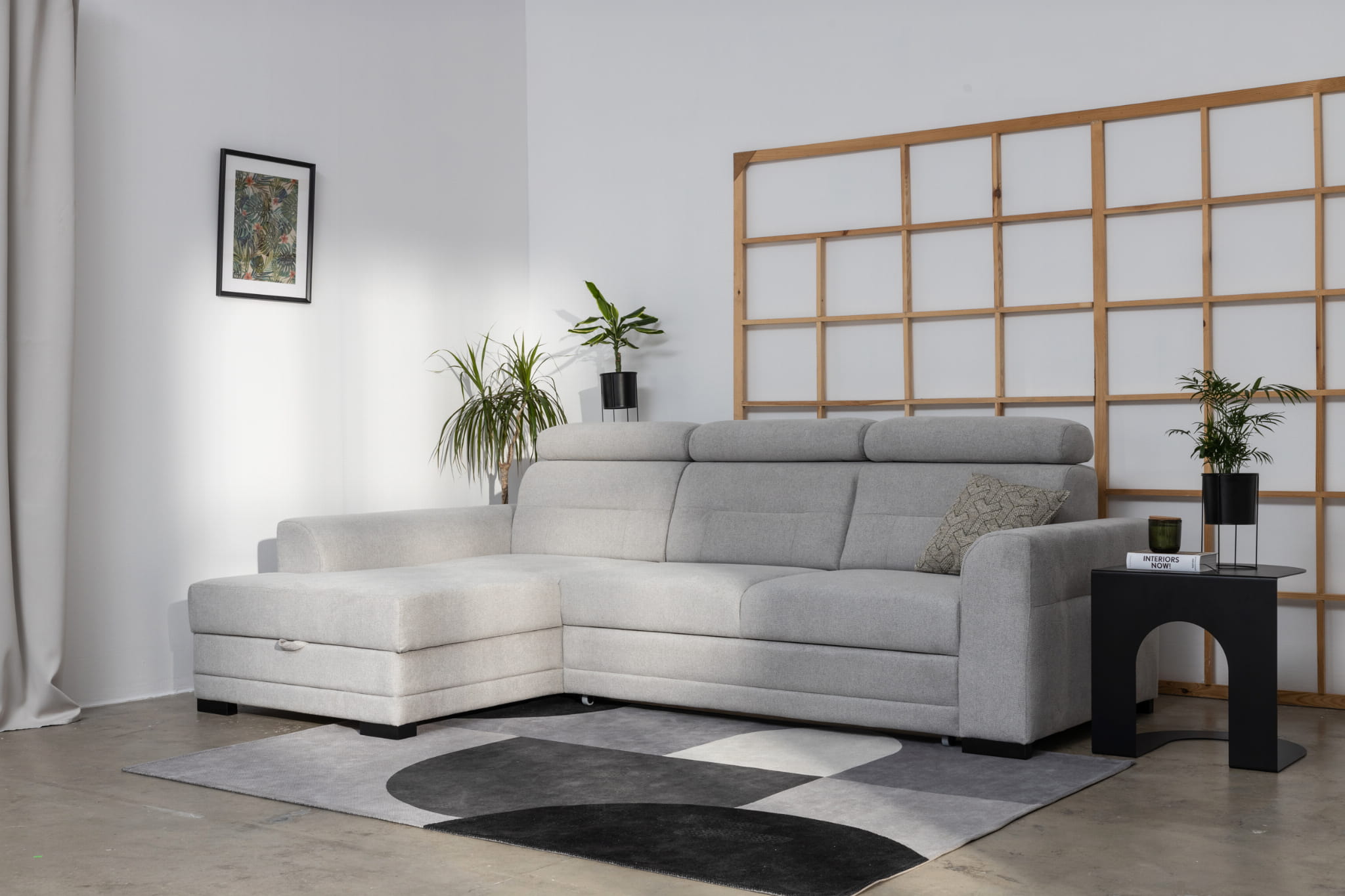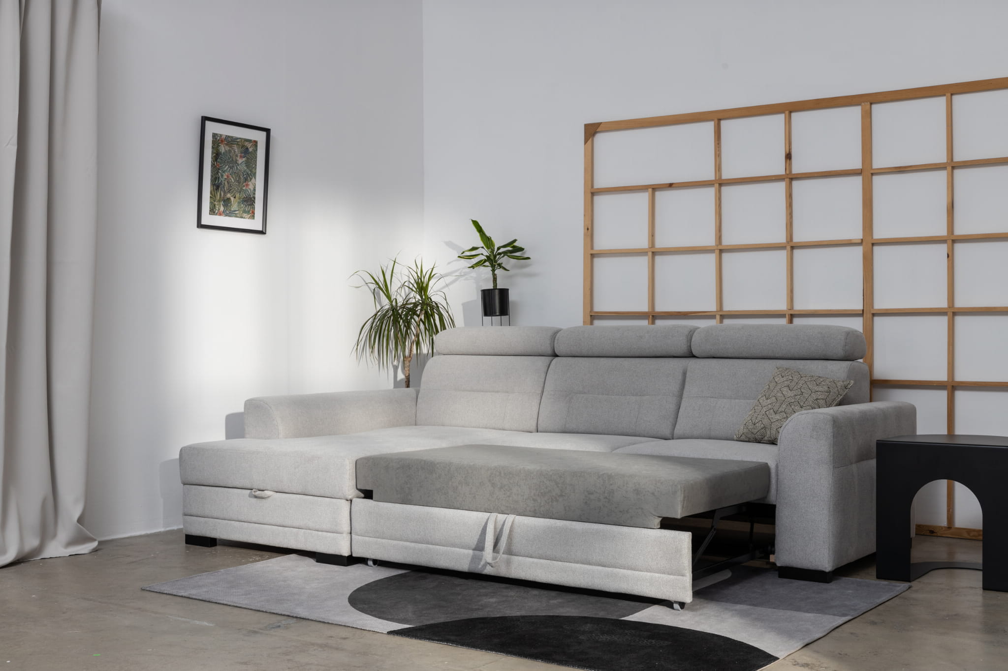 - Funkcja spania Delfin – płynny mechanizm pozwala szybko przekształcić narożnik w łóżko.