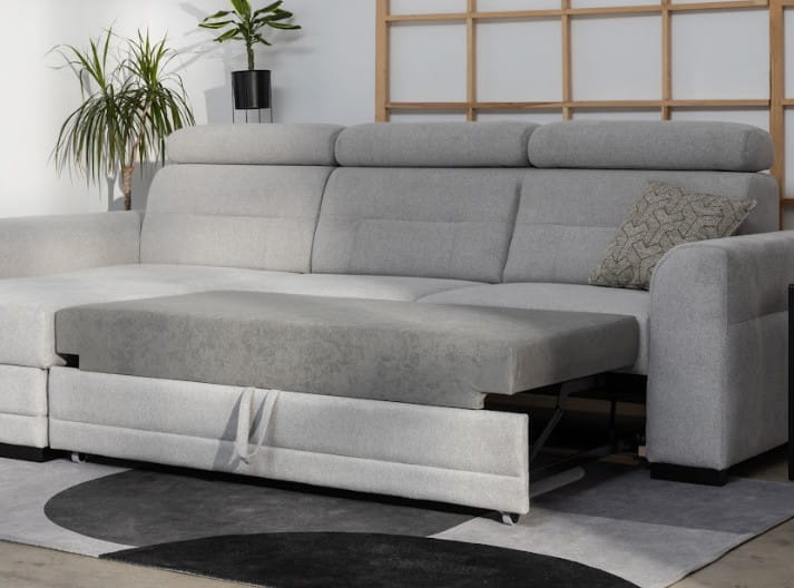 - Wykończenie funkcji spania: standardowo tkanina techniczna; opcjonalnie ta sama tkanina co na narożniku (dopłata).