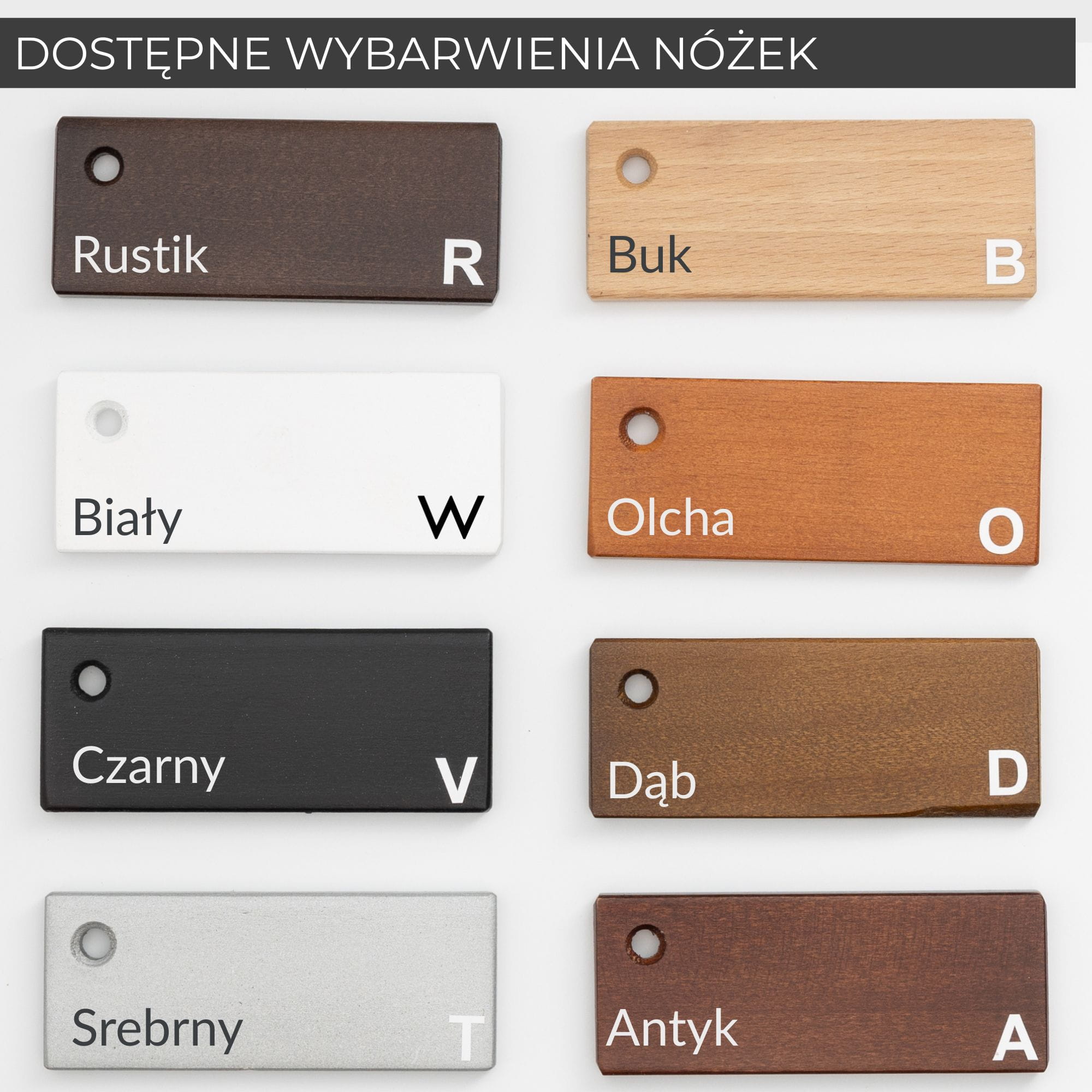 - Nogi: drewniane – dostępne wybarwienia: rustik, srebrny, biały, buk, czarny, olcha, antyk, dąb.