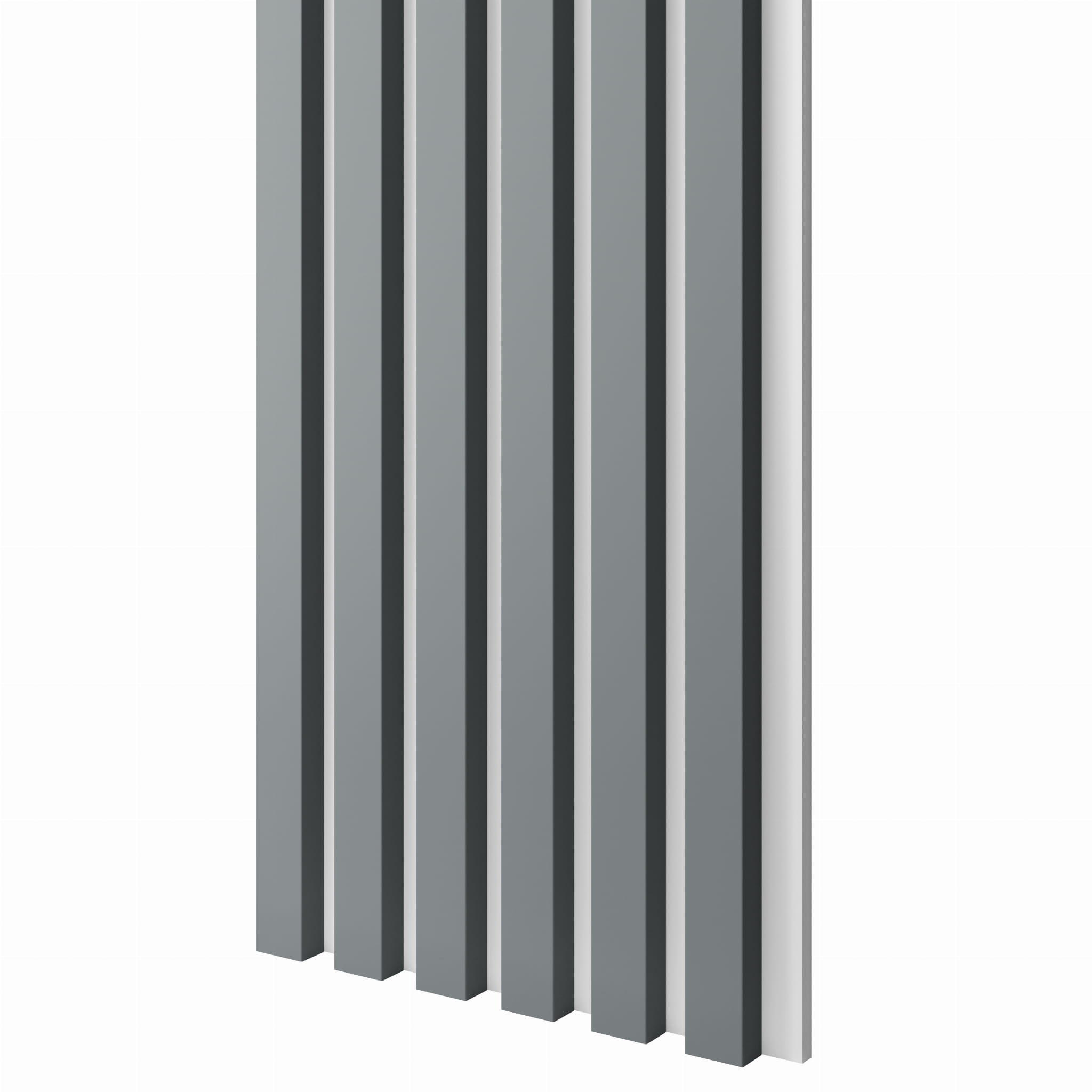 - Lamele Slim 3x1,8 cm w kolorze grafitowym zamontowane na białej, matowej płycie MDF – estetyczna i nowoczesna dekoracja ścienna lub sufitowa.