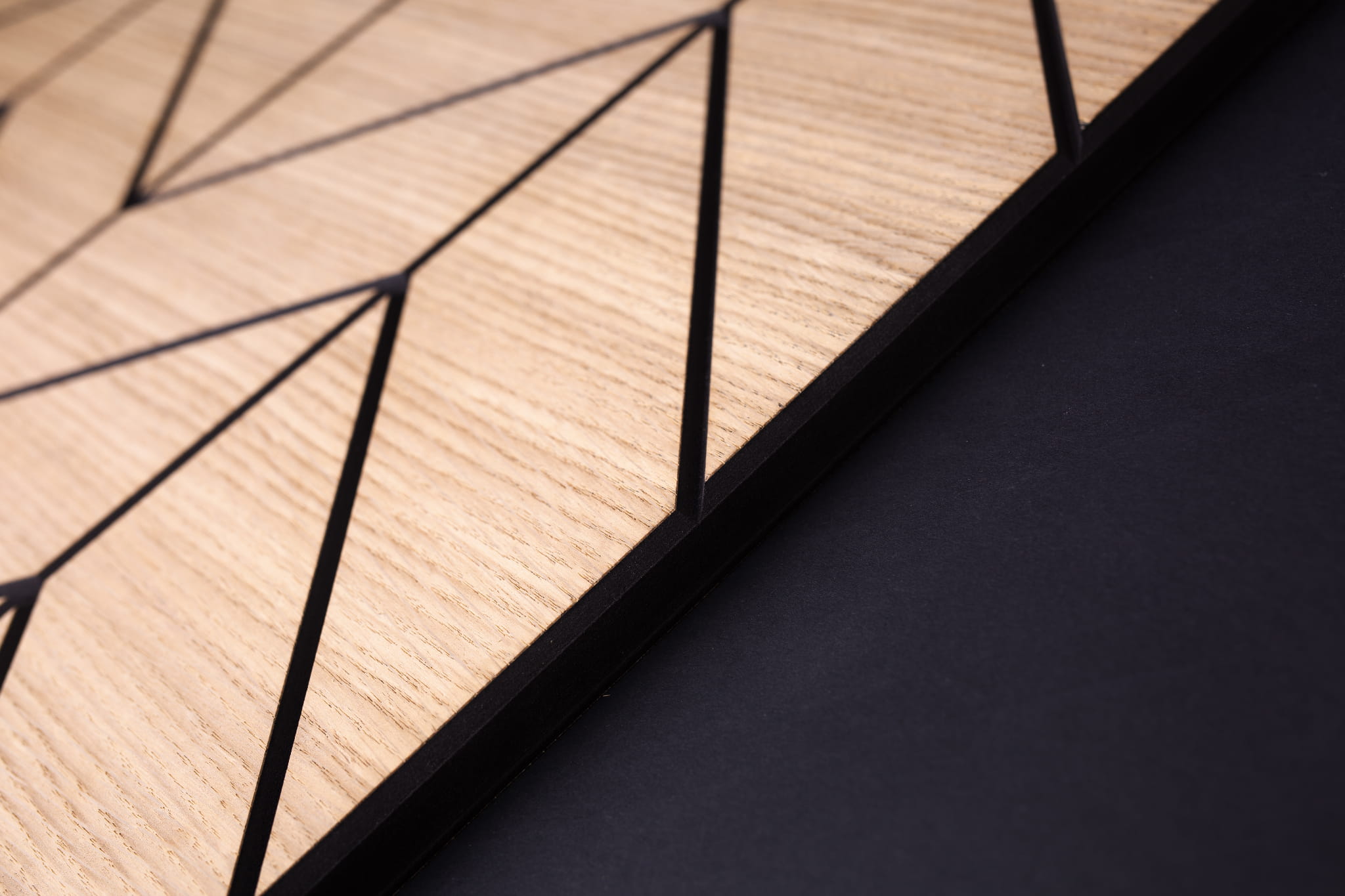 Kwadratowy panel Pirin LEO to nowoczesny element dekoracyjny wykonany z lameli o wymiarach 50x50 cm, wykonany z czarnej płyty MDF barwionej w masie, pokryty fornirem dębowym w stanie surowym (do olejowania). Panel łączy efektowny wygląd z funkcją poprawy akustyki wnętrza.