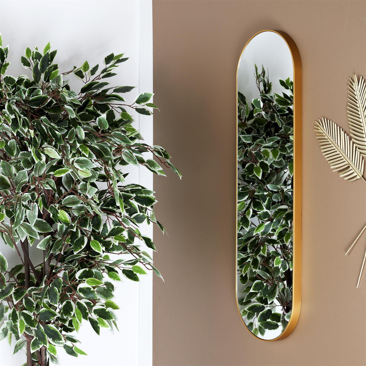 Lustro Camomille to uroczy dodatek do eleganskiej łazienki czy sypialni w stylu boho. Wiszące lustro o owalnym kształcie posiada plastikową ramę w kolorze złotym. Dzięki smukłej formie nada wnętrzu lekkości. Będzie się pięknie komponować z roślinami oraz minimalistycznymi dodatkami. Ilość kartonów: 1 Wymiary kartonów: 30x100x3cm