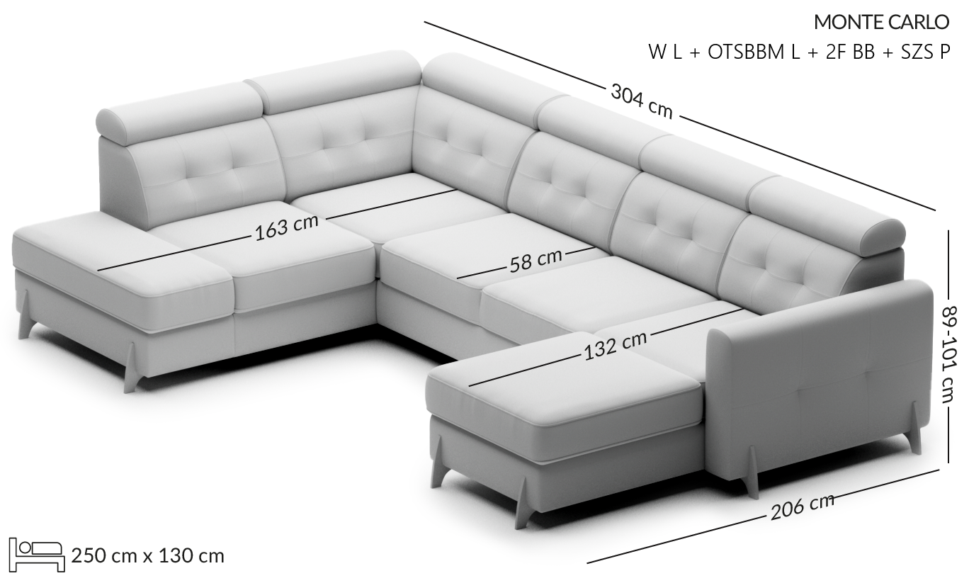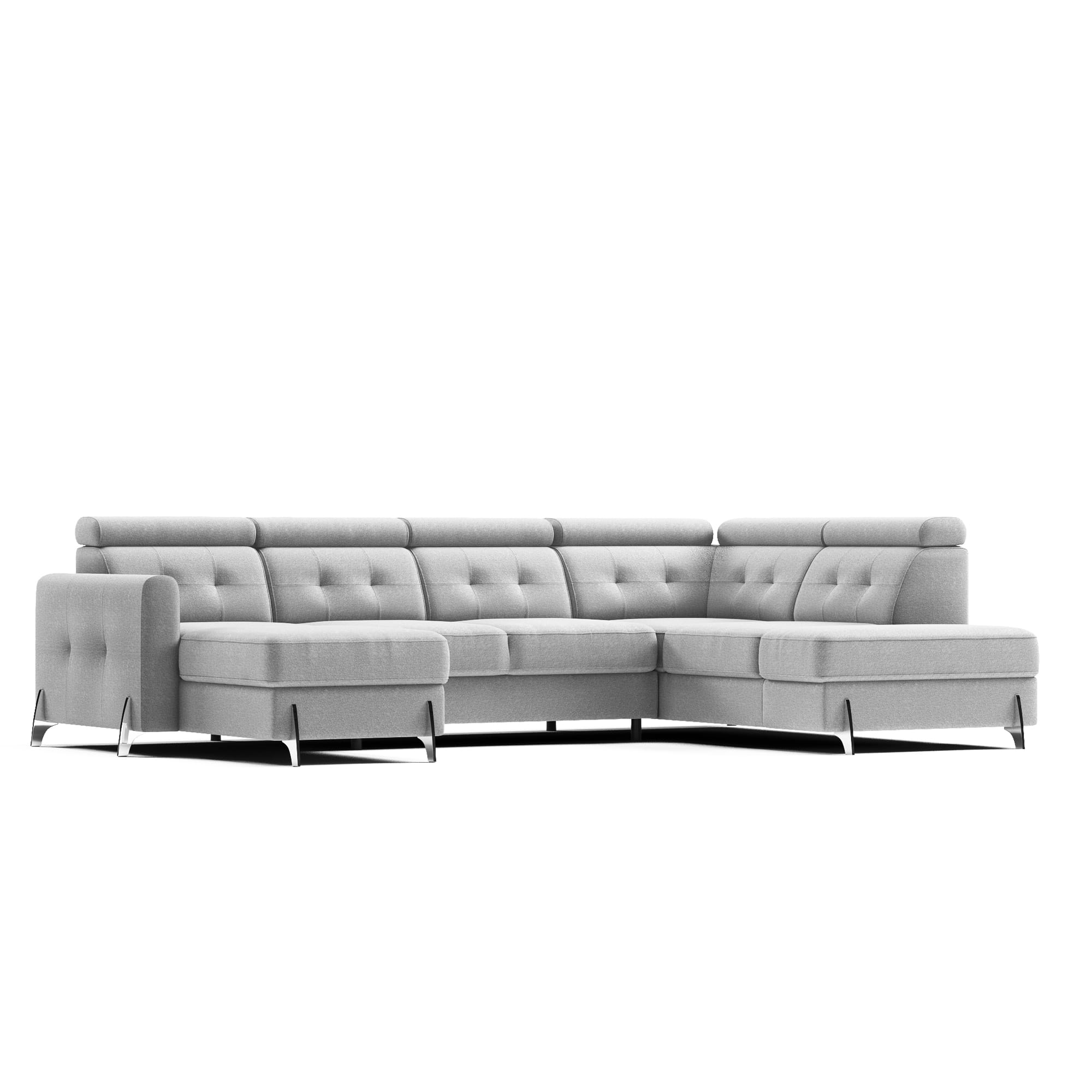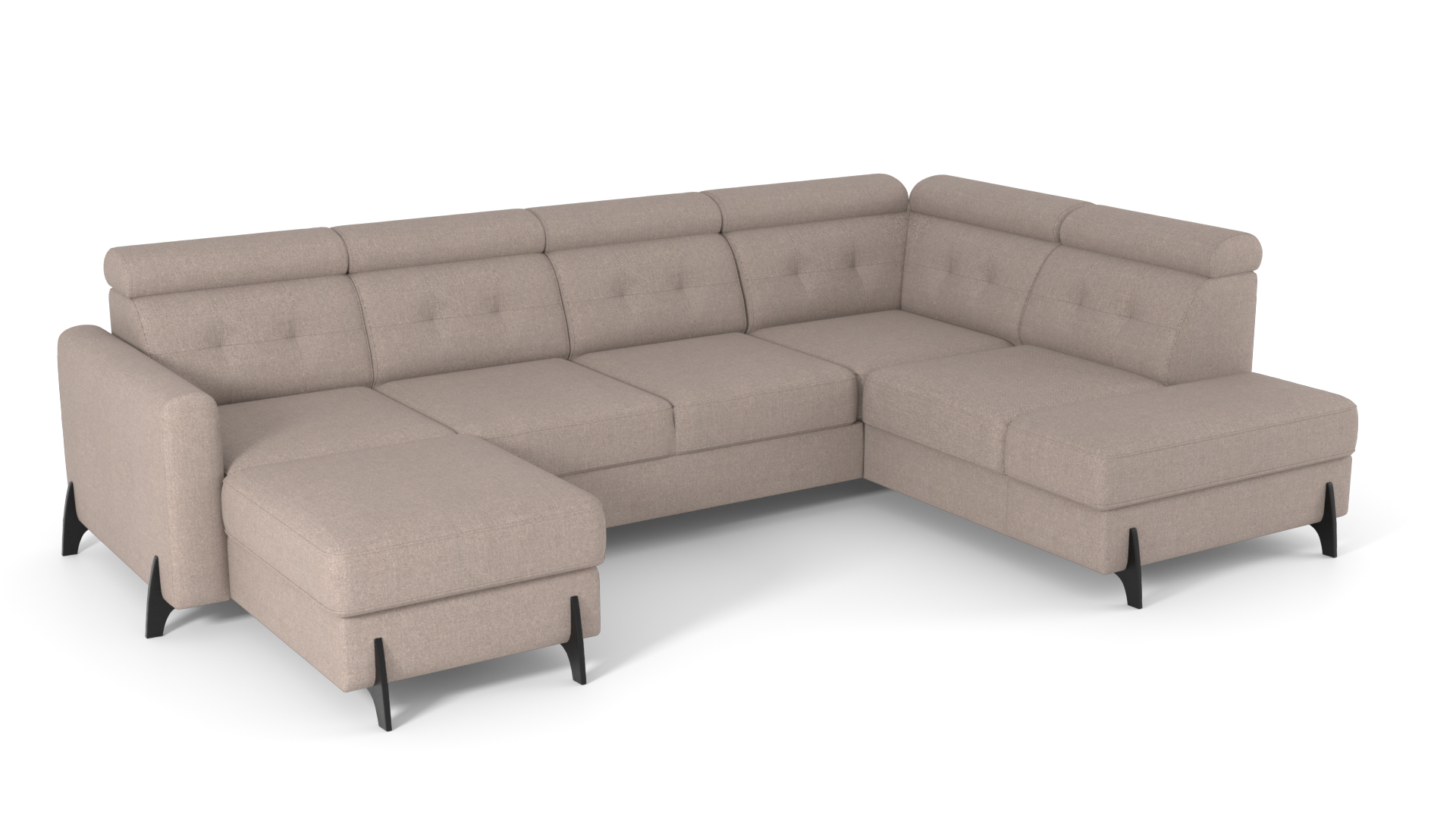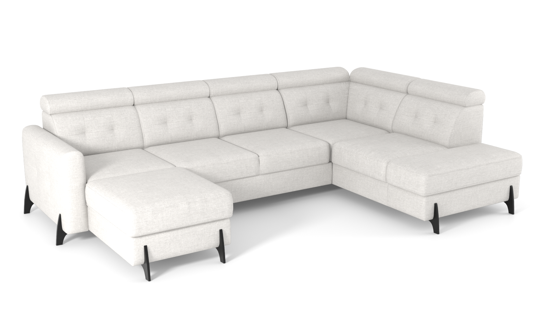 Narożnik Monte Carlo w kształcie litery U to elegancki, przestronny mebel stworzony z myślą o dużych salonach. Jego nowoczesna forma, efektowne pikowania i regulowane zagłówki zapewniają wysoki komfort użytkowania, a metalowe nogi dodają lekkości i loftowego charakteru.