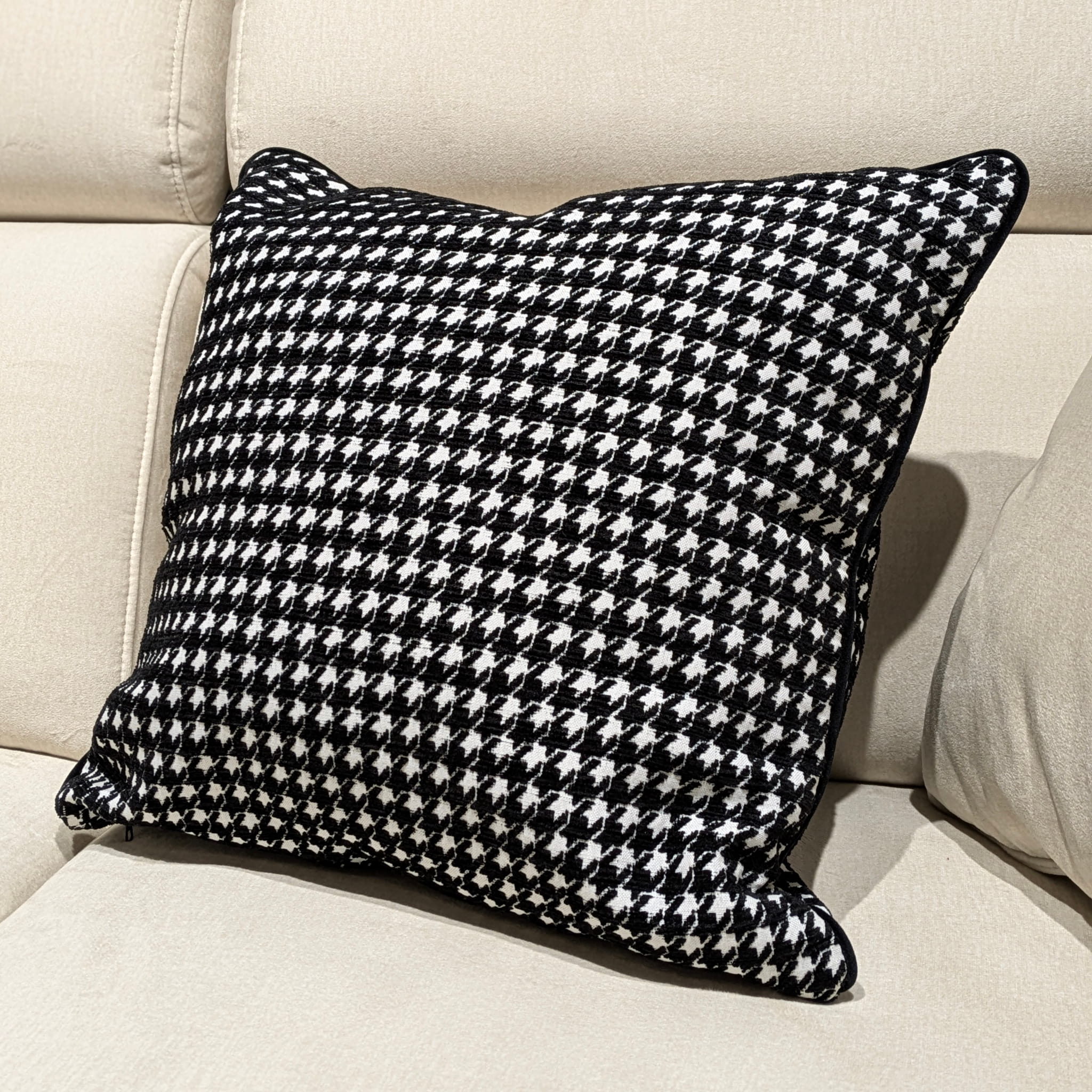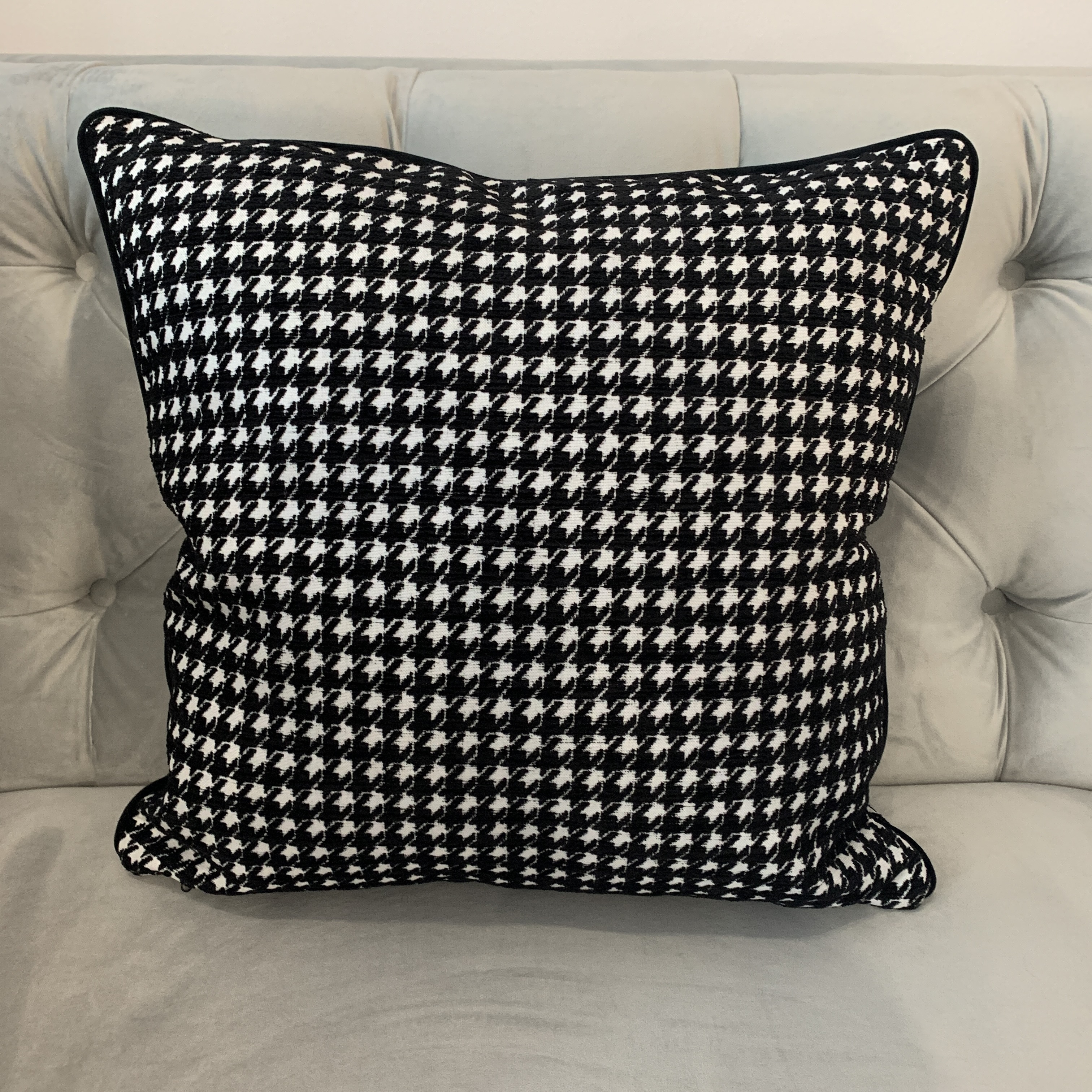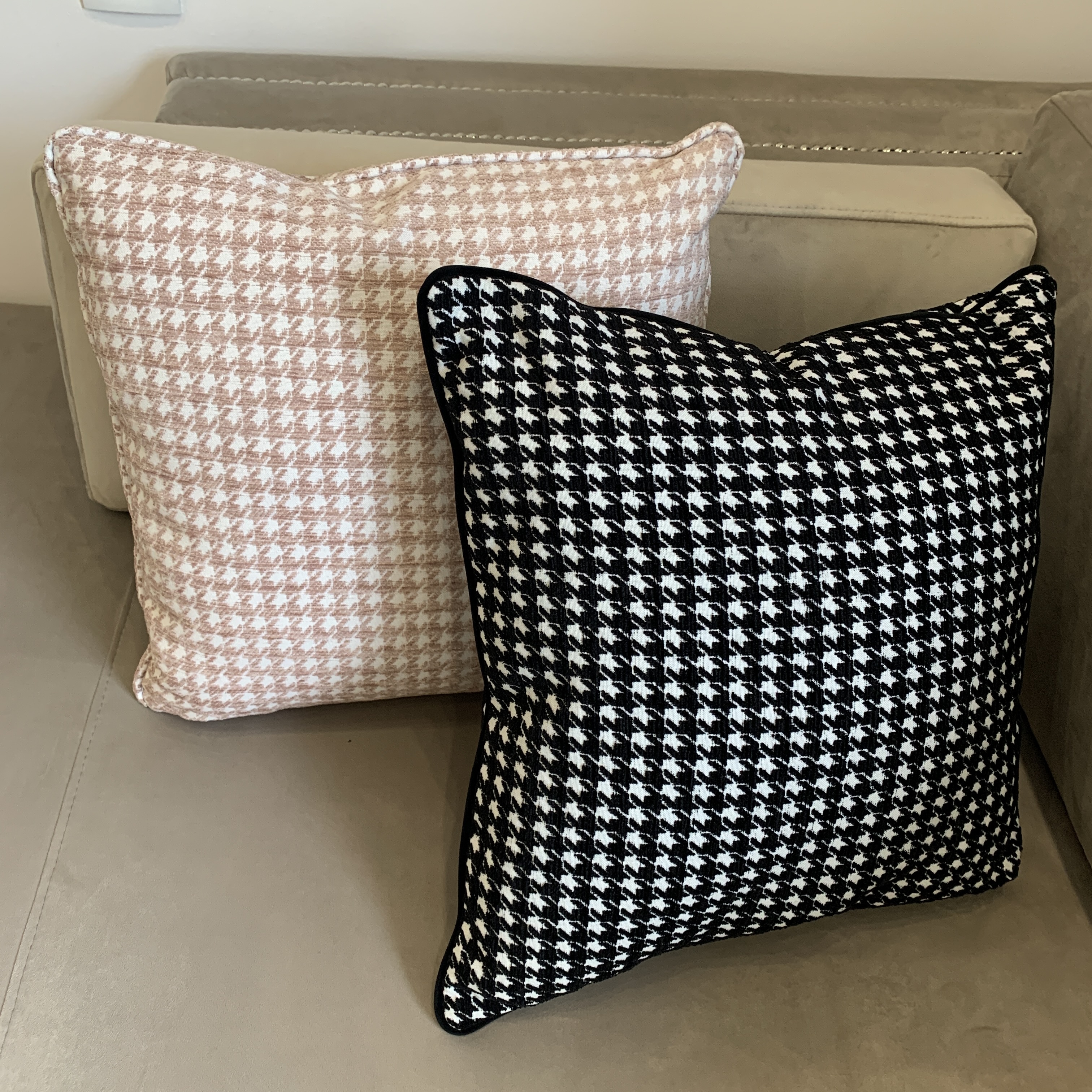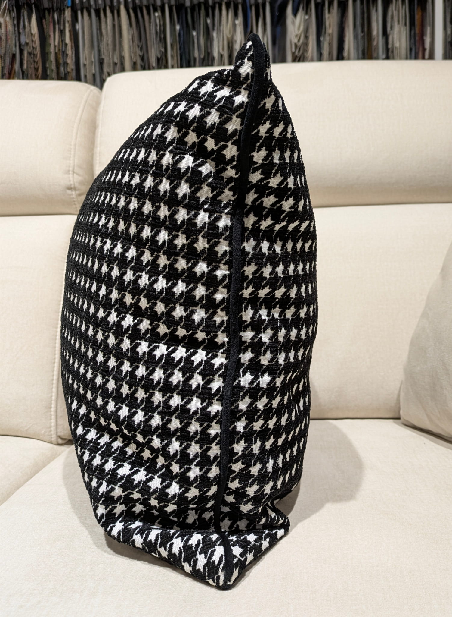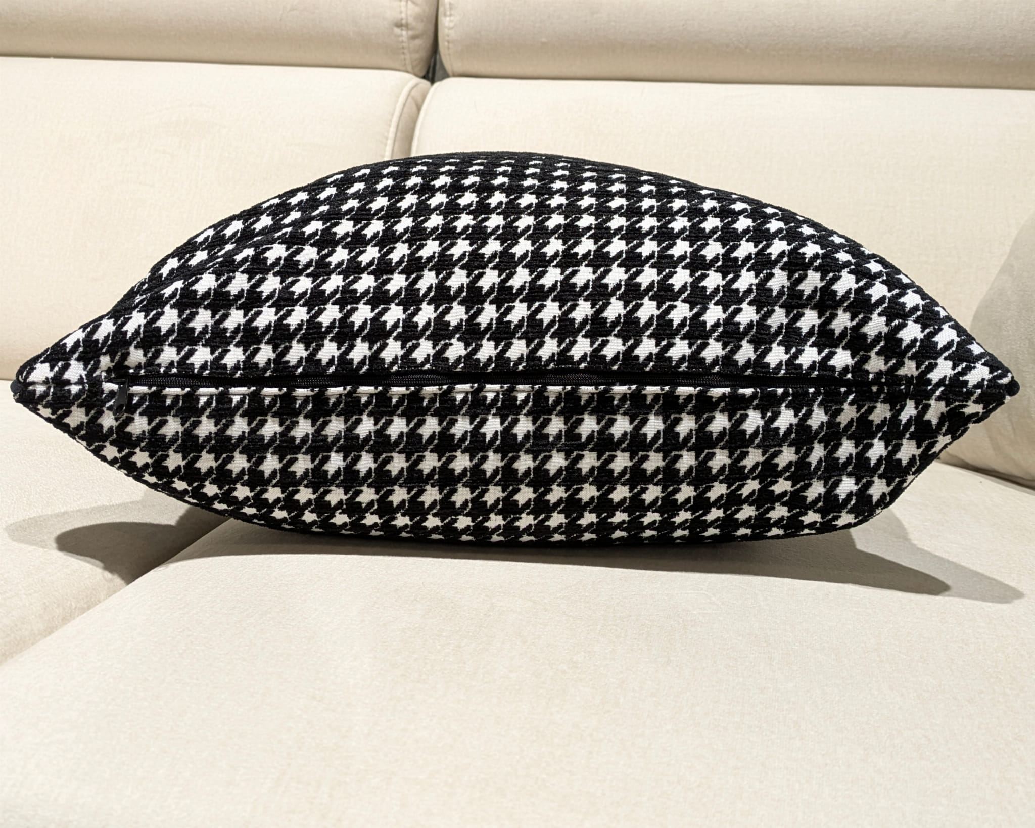 - Klasyczny wzór pepitki w czarno-białej kolorystyce nadaje wnętrzu elegancji i ponadczasowego charakteru.