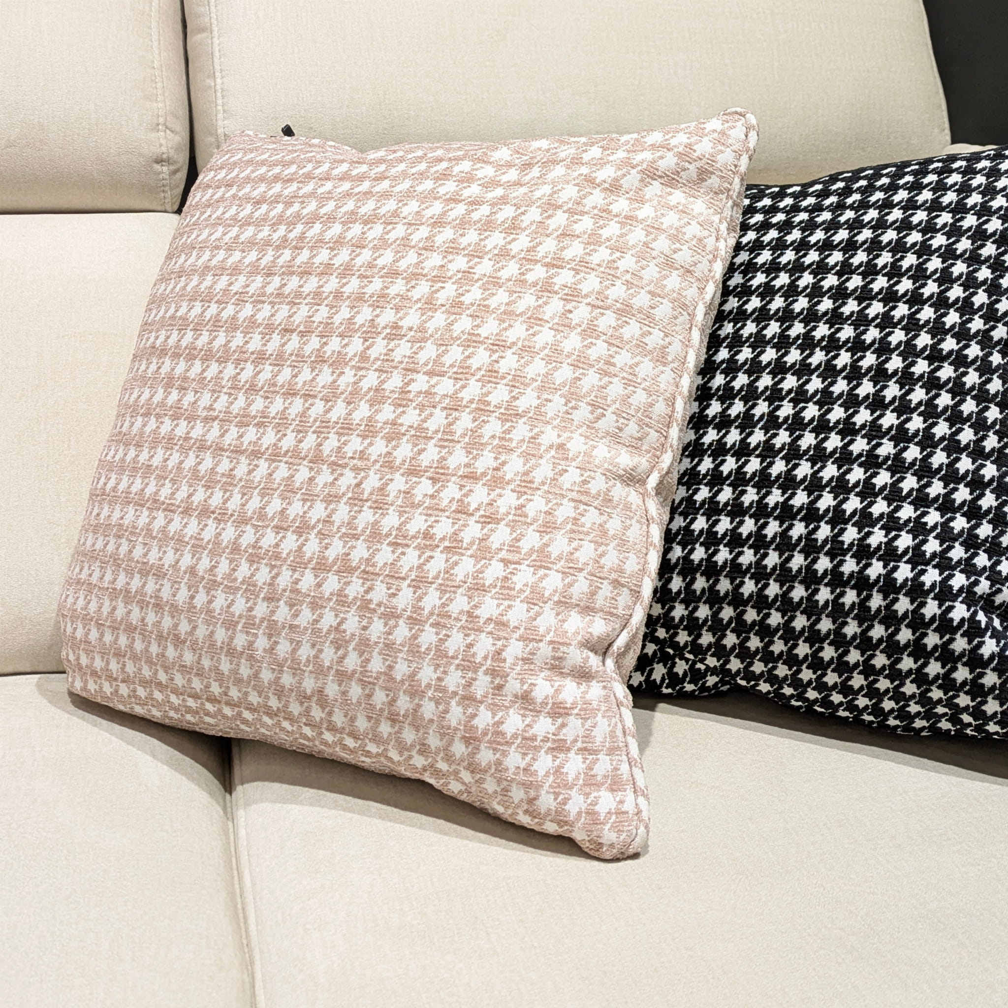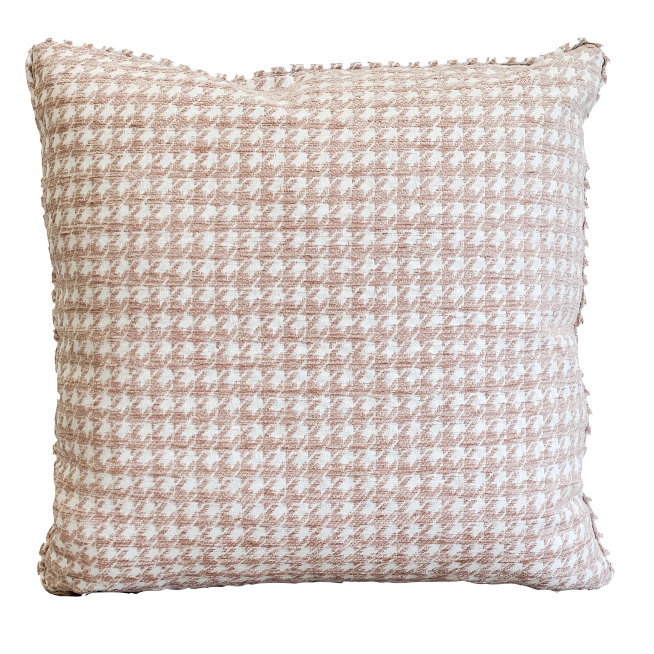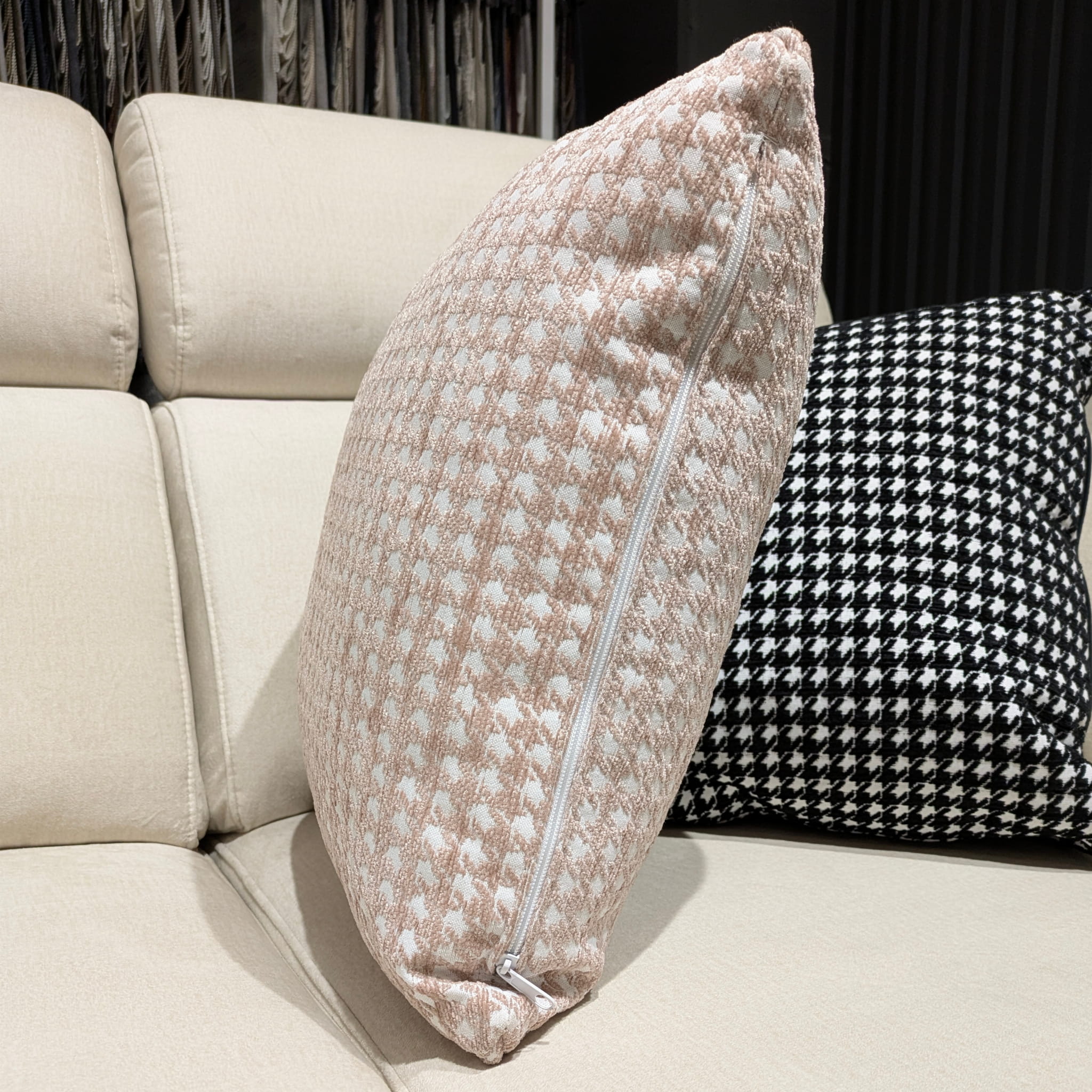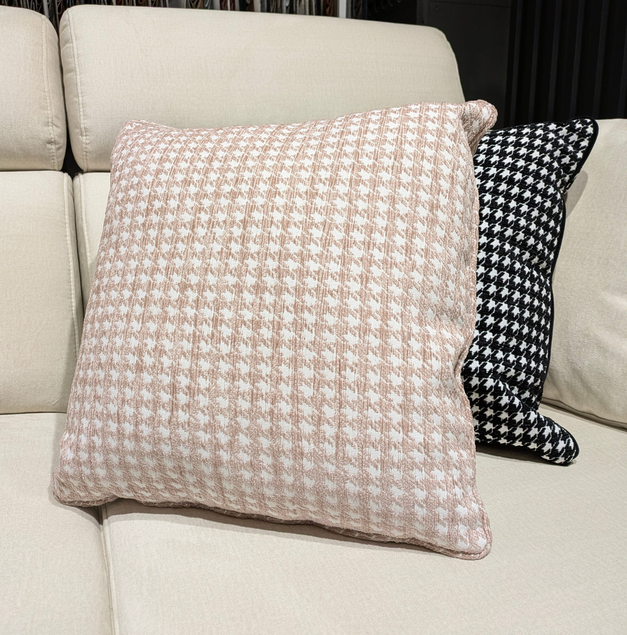 - Klasyczny wzór pepitki w delikatnej, różowej kolorystyce wprowadza do wnętrza subtelny akcent i stylowy charakter.