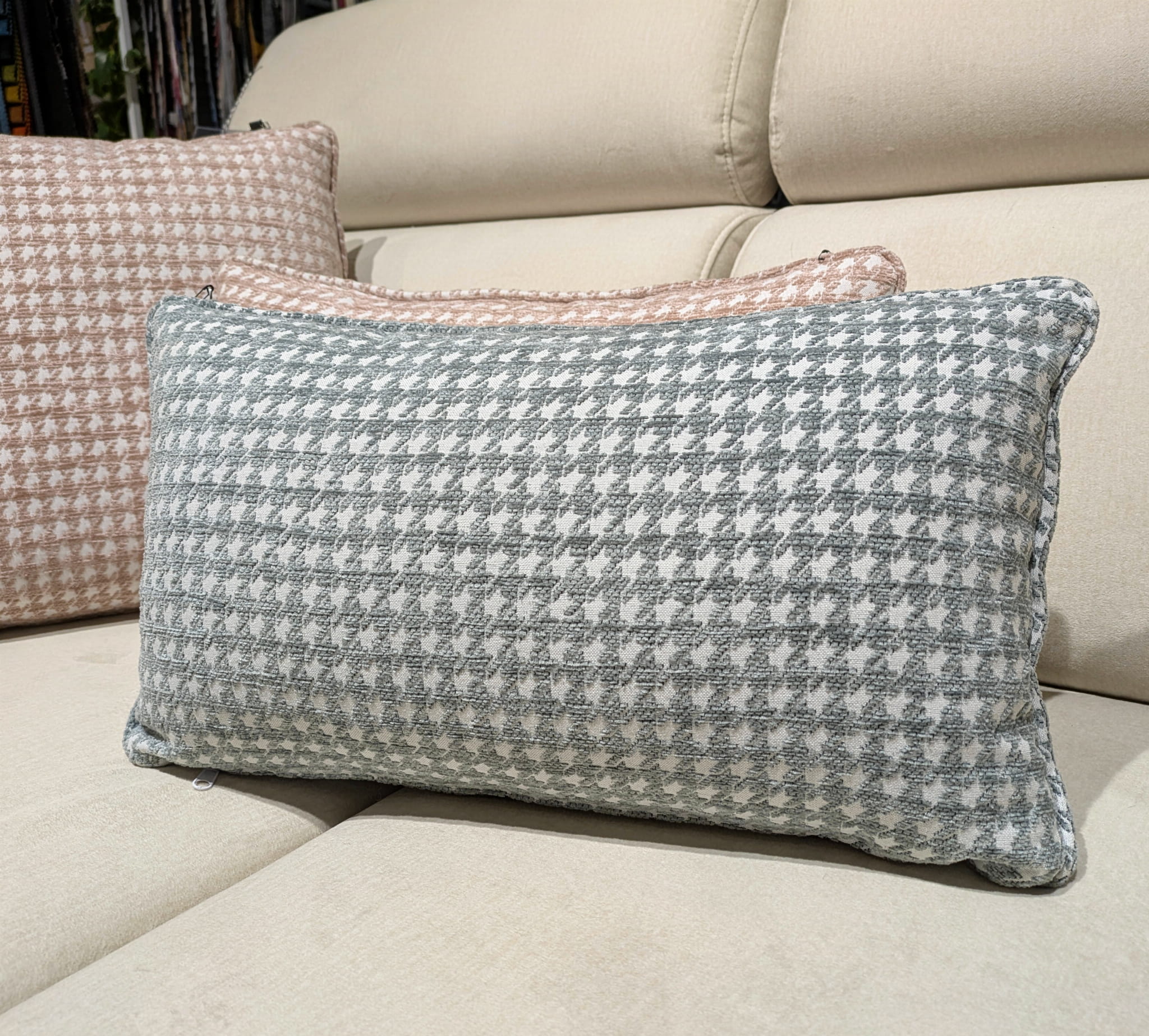 - Poduszka wykończona lamówką w kolorze szarej pepitki, która estetycznie podkreśla jej formę.