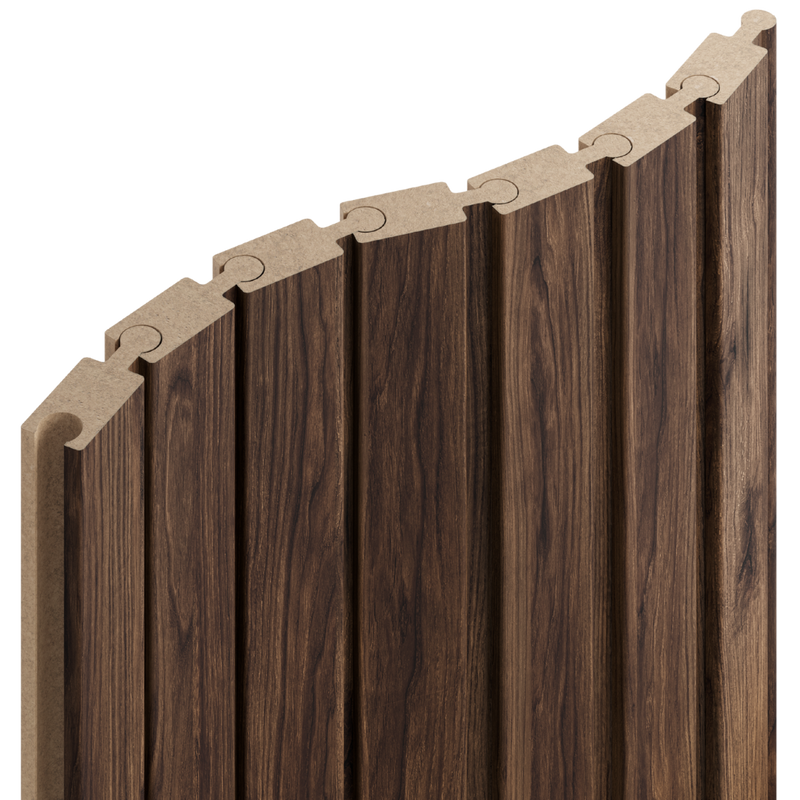 Prawa listwa zakończeniowa do lameli Flex L3D w kolorze orzech klasyczny to elegancki element wykończeniowy, który pozwala estetycznie domknąć dekorację po prawej stronie. Głęboki, ciemny odcień drewna inspirowany klasycznym orzechem nadaje wnętrzu prestiżowy i ponadczasowy charakter, zapewniając spójny efekt na ścianach oraz sufitach.