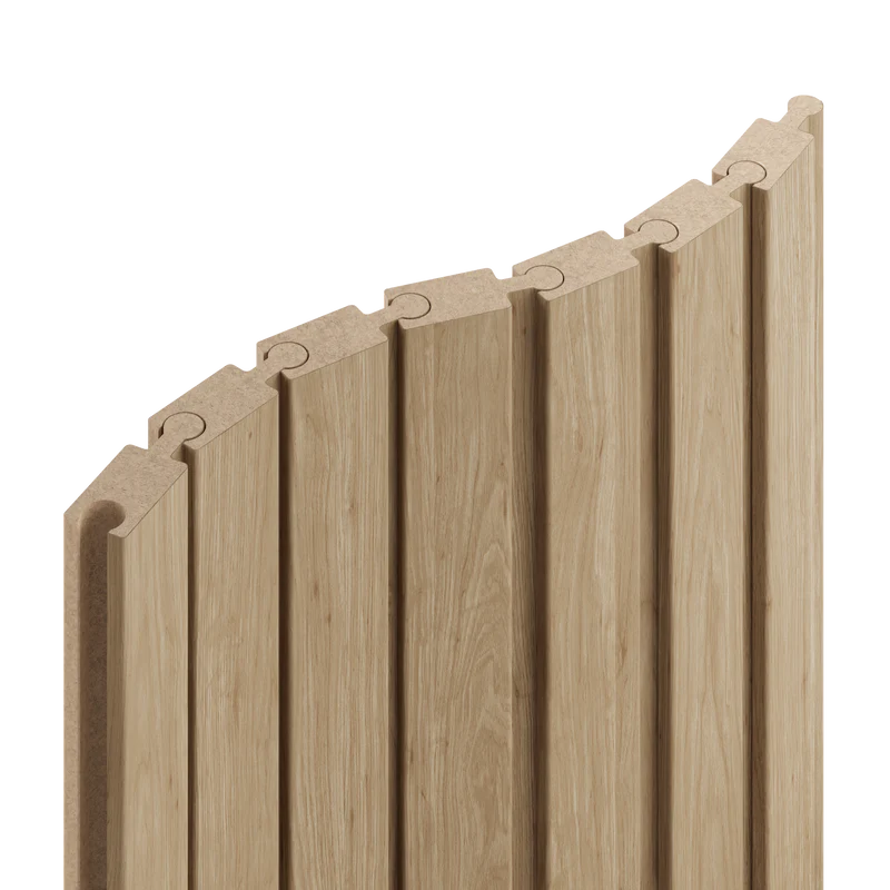 Prawa listwa zakończeniowa do lameli Flex L3D w kolorze dąb naturalny to estetyczny element wykończeniowy, który pozwala elegancko domknąć dekorację po prawej stronie. Neutralny, jasny odcień drewna wprowadza do wnętrza ciepło i harmonię, zapewniając spójny i ponadczasowy efekt na ścianach oraz sufitach.